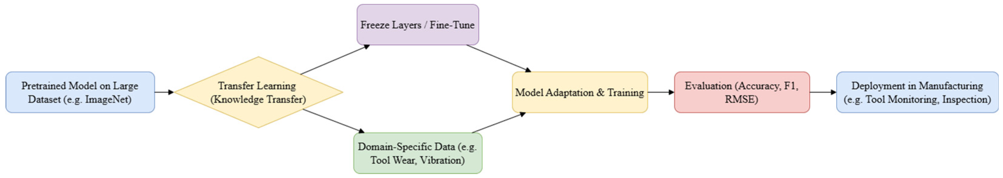 | Transfer Learning Hybrids | 1. Pre-trained CNN (on ImageNet) 2. Target Task (Tool Wear) | A CNN (EfficientNetB0) pre-trained on general image features was fine-tuned on a relatively small dataset of milling tools. | High performance with limited data: Enabled achieving a very high classification accuracy from a small, domain-specific dataset, which would be difficult with training from scratch. | Papenberg et al. (2023): Utilized transfer learning to classify milling tool wear [45]. |