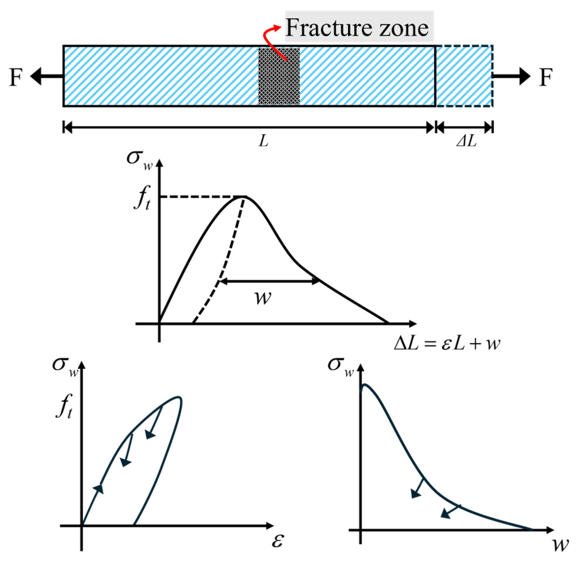 - Hillerborg, A.; Modéer, M.; Petersson, P.E. Analysis of crack formation and crack growth in concrete by means of fracture mechanics and finite elements. Cem. Concr. Res. 1976, 6, 773–781. [Google Scholar] [CrossRef]