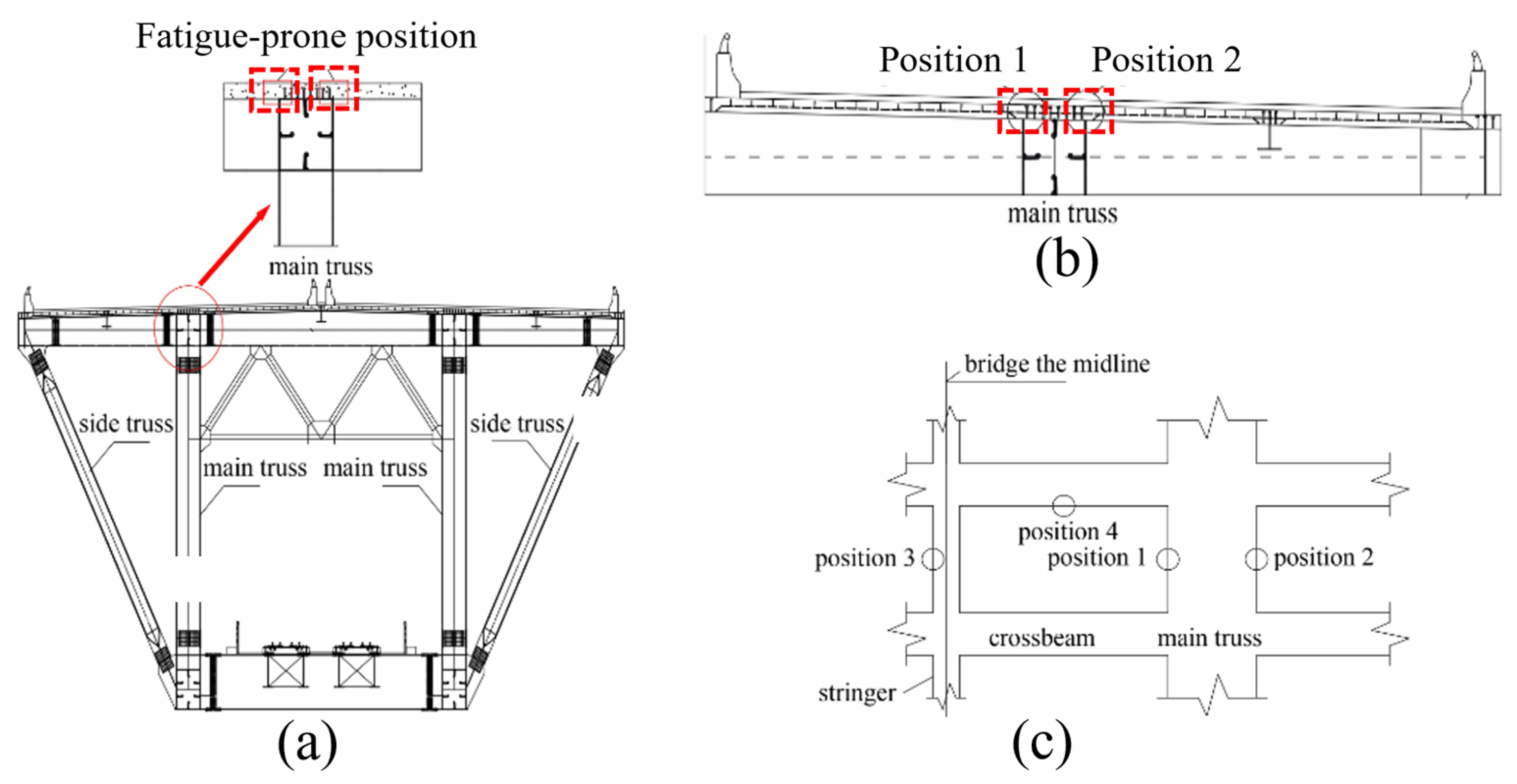 - Chen, H.T.; Zhan, X.W.; Zhu, X.F.; Zhang, W.X. Fatigue evaluation of steel-concrete composite deck in steel truss bridge—A case study. Front. Struct. Civ. Eng. 2022, 16, 1336–1350. [Google Scholar] [CrossRef]