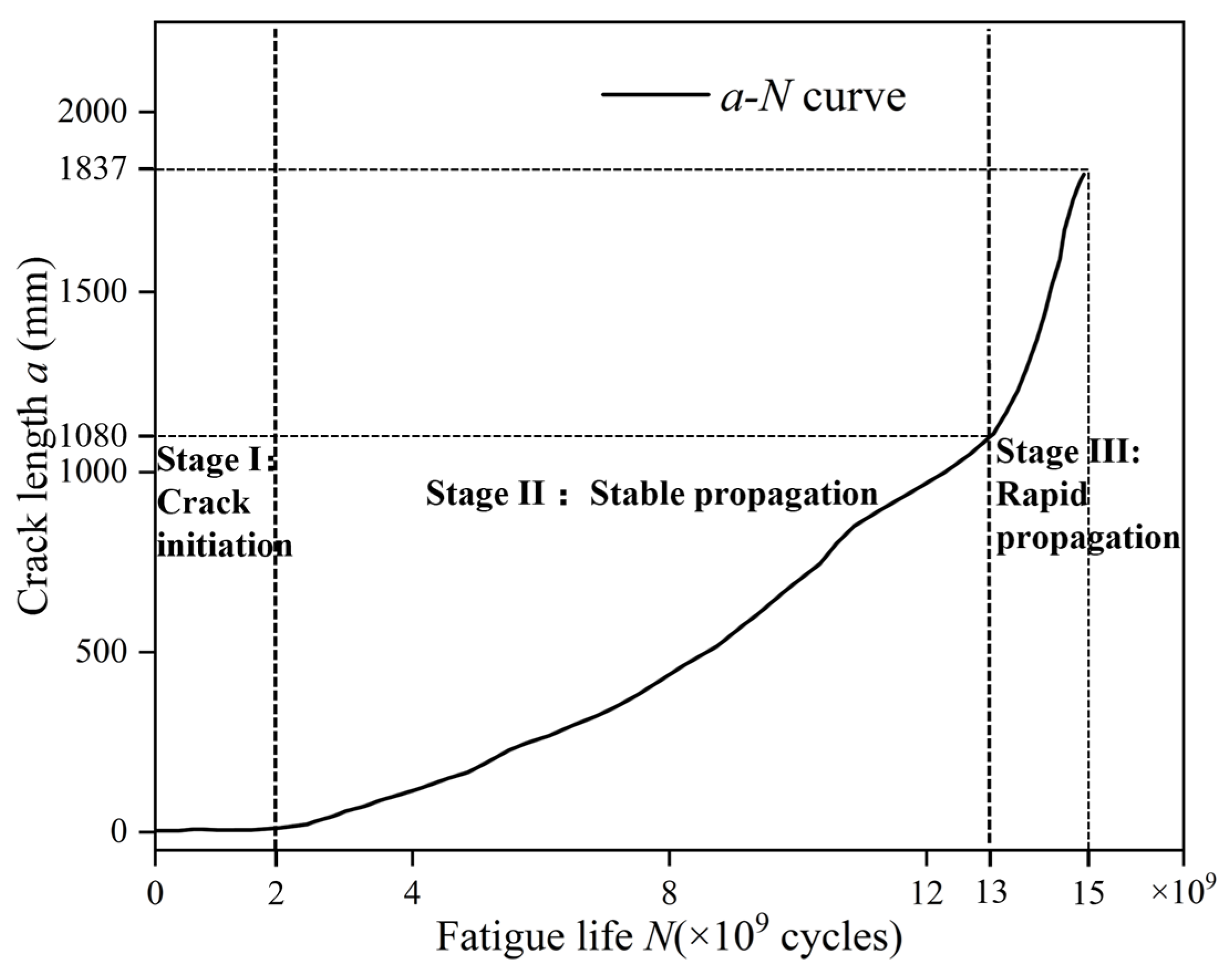 - Zhuo, Y.F. Research on the Fatigue Crack Growth Life of Bridge Deck Concrete Based on Statistical Probability. Master’s Thesis, Beijing University of Technology, Beijing, China, 2025. (In Chinese). [Google Scholar]
