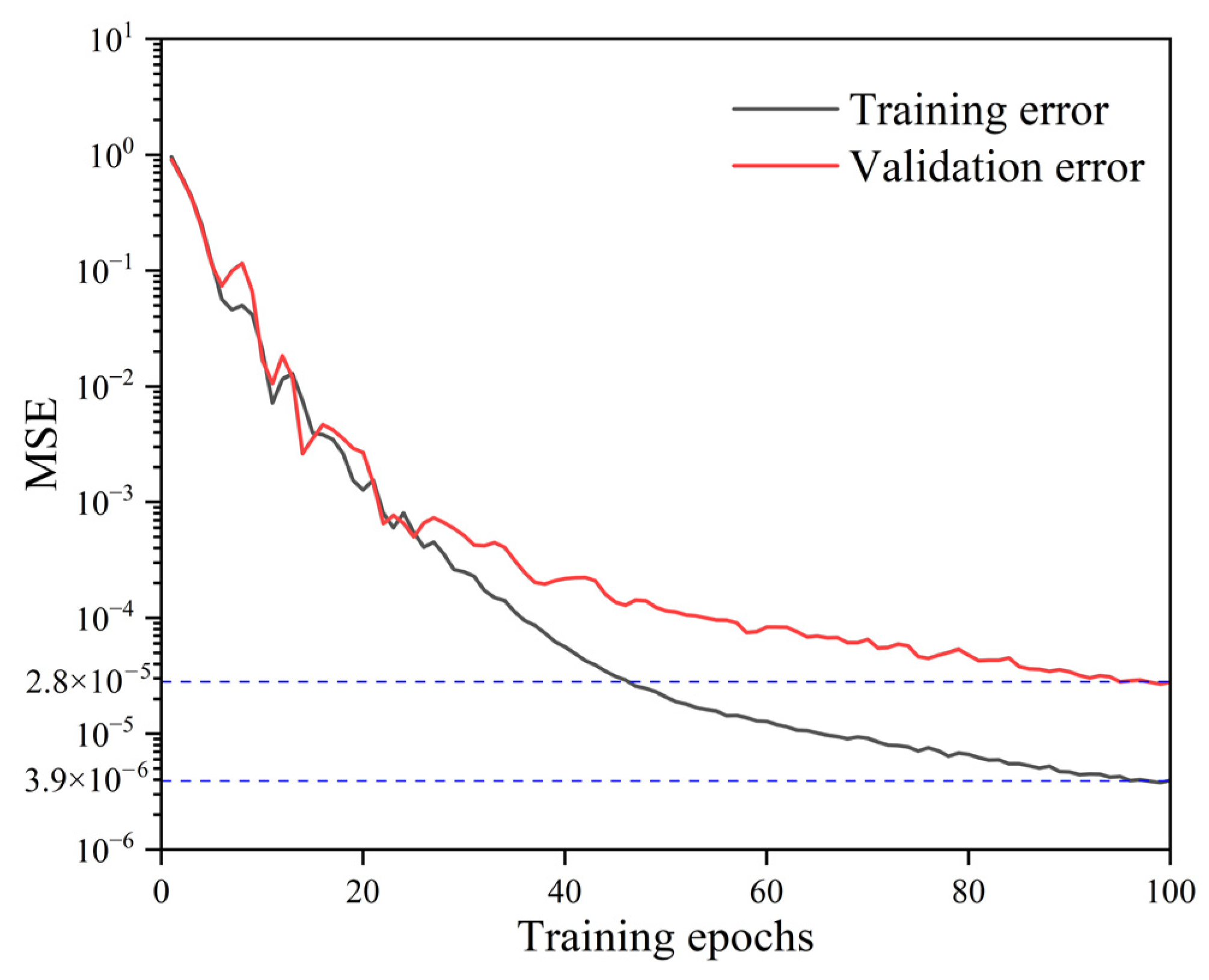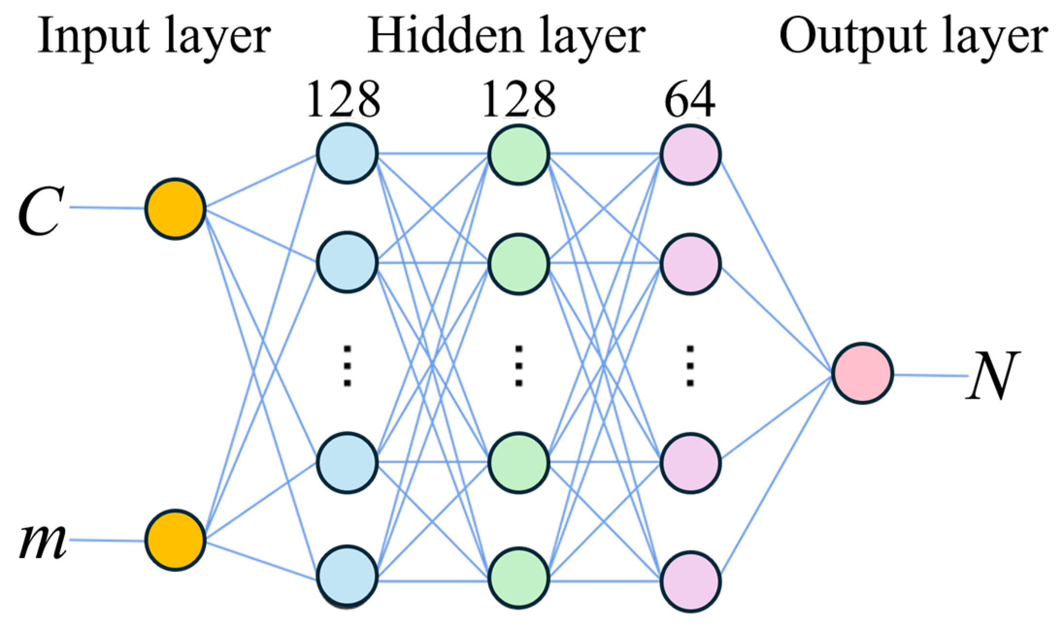 - Based on the statistical characteristics of the Paris law parameters C and m, 100 sets of random parameter combinations were generated from normal distributions using Python’s random sampling functions. The XFEM was employed to simulate crack initiation and propagation under cyclic loading, and the resulting fatigue life data served as the foundation for the subsequent ANN training and verification.