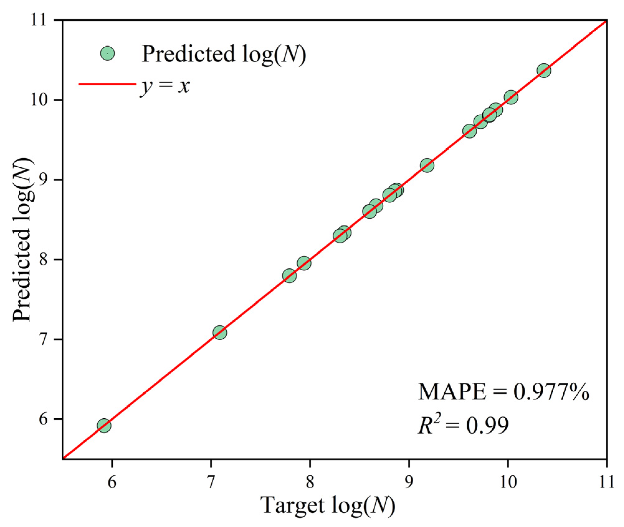 - A feedforward back-propagation neural network with three hidden layers (128–128–64) was constructed in Python using the ReLU activation function and Adam optimization algorithm. The model was trained by minimizing the Mean Squared Error (MSE) and evaluated through Mean Absolute Error (MAE) and Mean Absolute Percentage Error (MAPE). The optimized ANN achieved R2 = 0.99 and MAPE = 0.977%, demonstrating high prediction accuracy and good generalization for fatigue life estimation of the bridge deck.