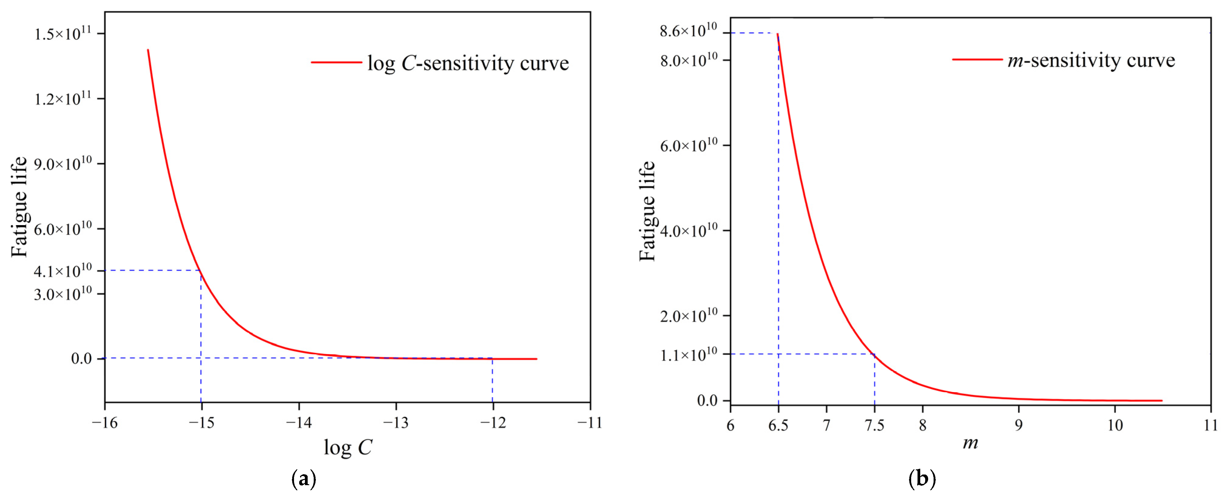 3.3. XFEM-Based Fatigue Crack Propagation and Material Parameters