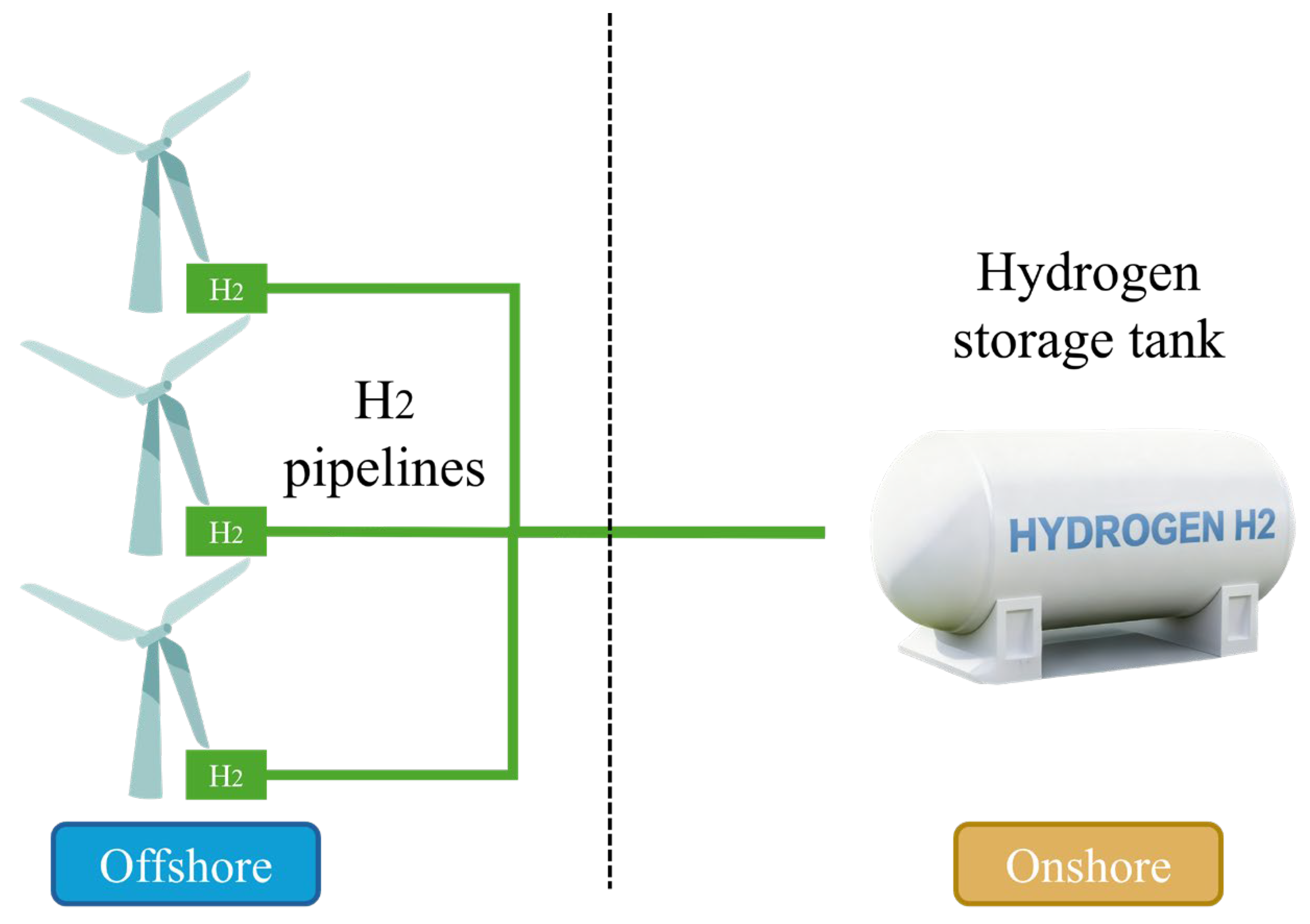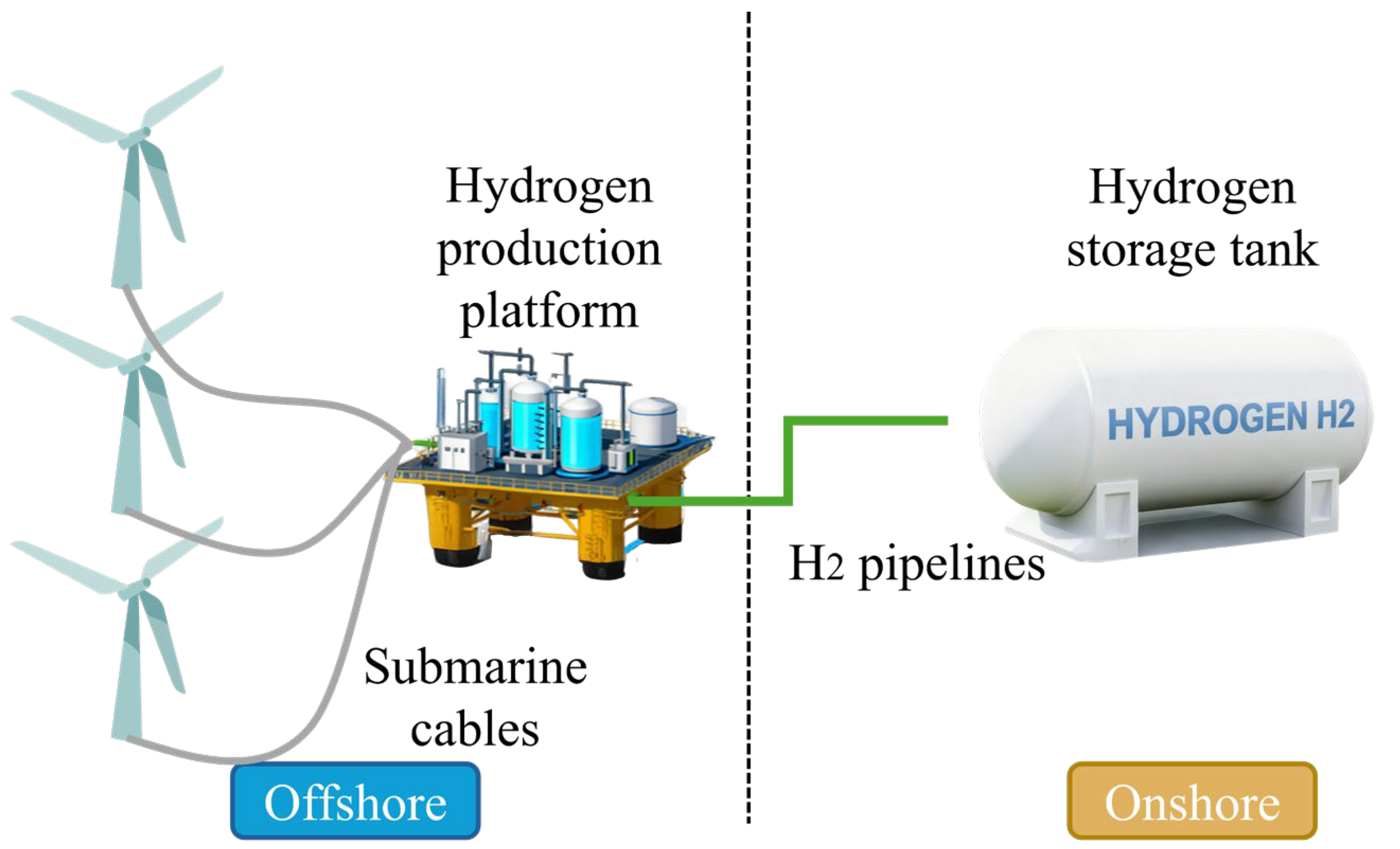 The first approach, the offshore distributed wind-to-hydrogen system, is illustrated in