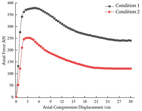 - Extract the primary support axial force at the installation location under different in situ stress conditions and analyze its variation during staged excavation. Based on these data, determine the appropriate range for the peak bearing capacity of the stress-relief elements.