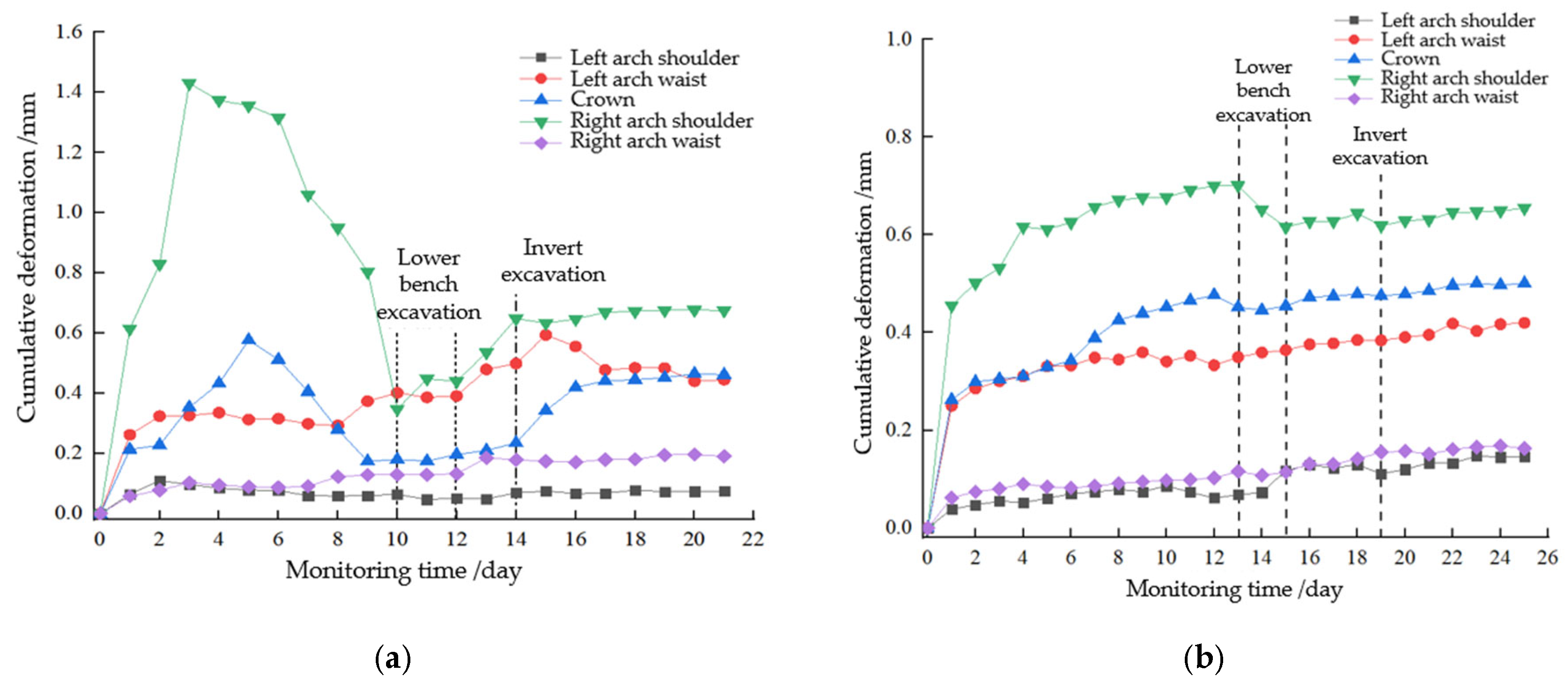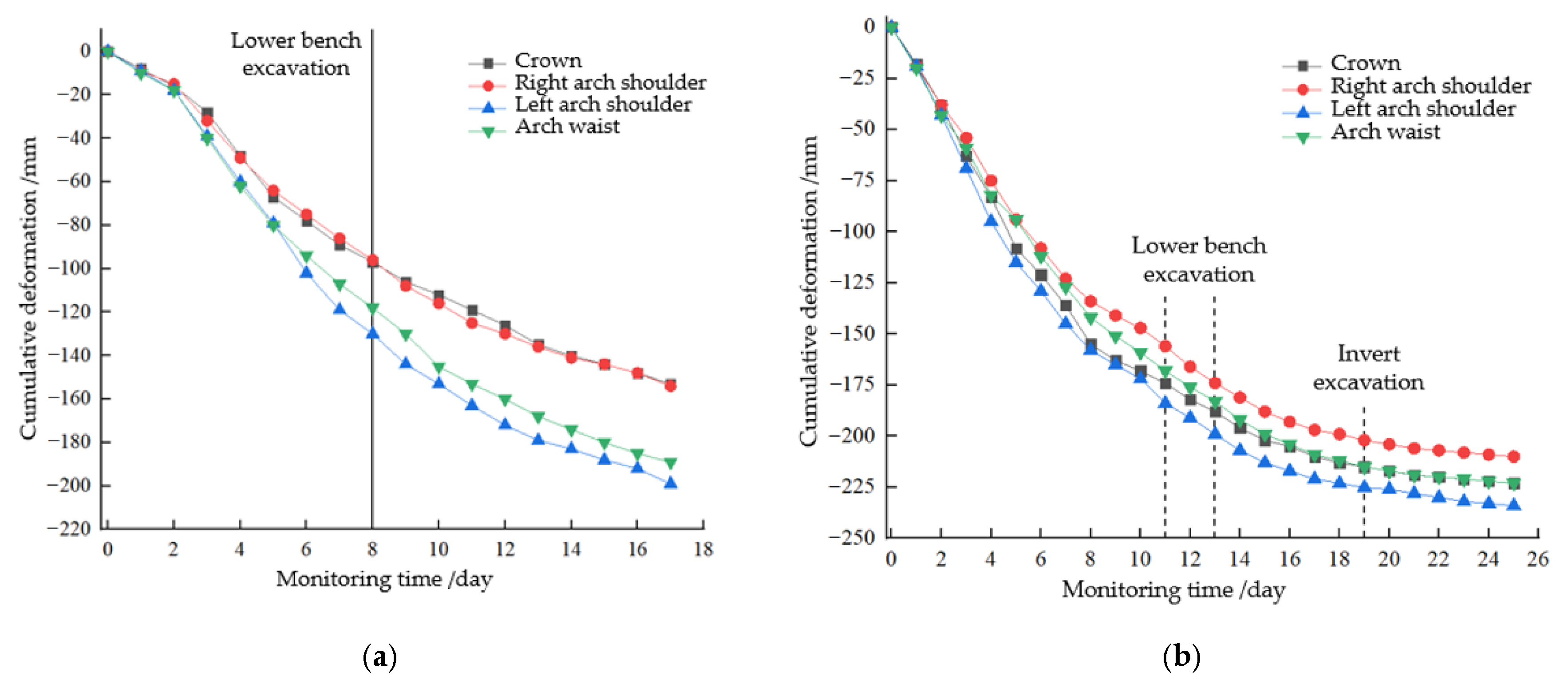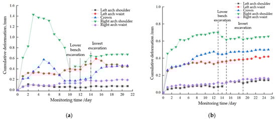 - Field application in the Qiaojia Tunnel shows significant improvement in deformation control. Crown settlement (22.3 cm) and shoulder differential deformation (2.4 cm) meet design limits. Compared with rigid support, peak surrounding-rock pressures decreased by 20.2–45.4%, and the left–right shoulder pressure difference was reduced by 59.2%, effectively mitigating asymmetric deformation.