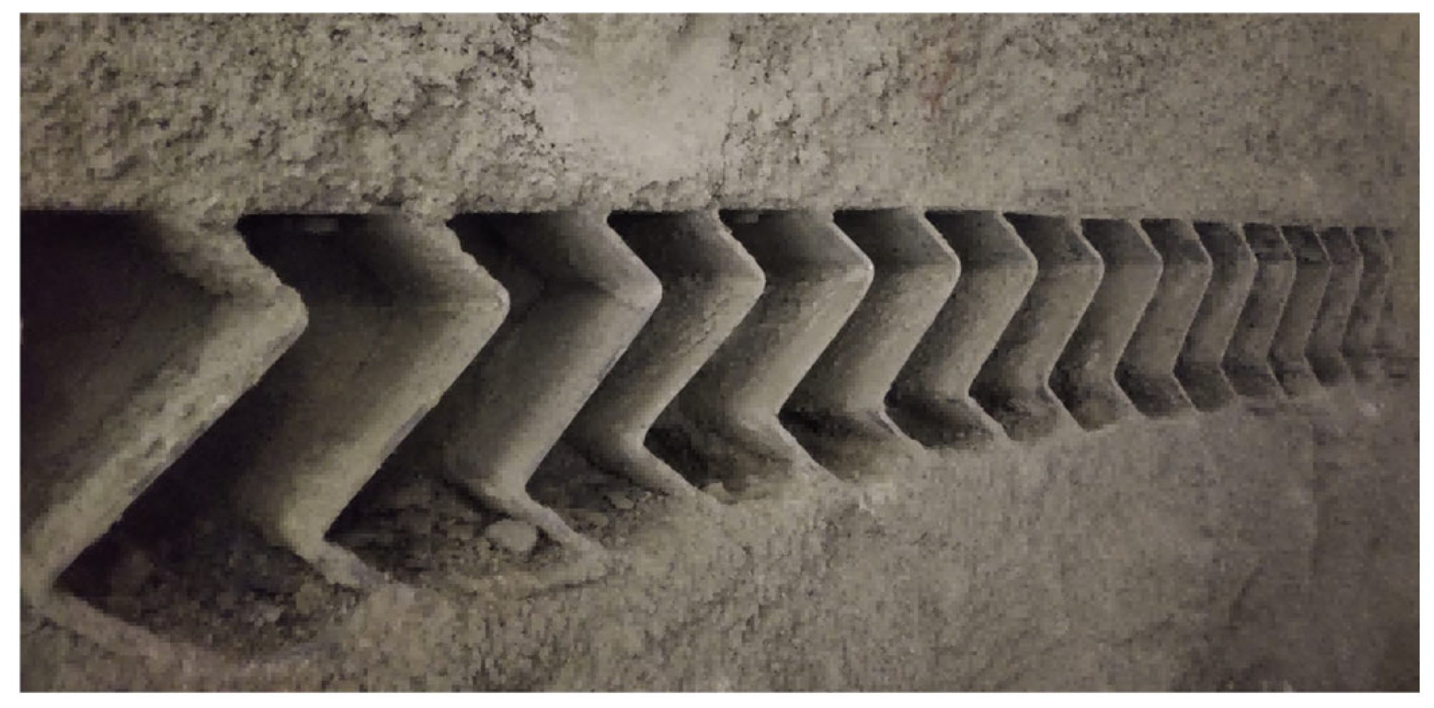 - After assembly, the primary shotcrete layer is applied. The gaps between the S-shaped steel plates are temporarily covered with wooden boards or geotextile to prevent inadvertent filling. The protection is removed after shotcreting to allow subsequent observation of the deformation behavior of the element.