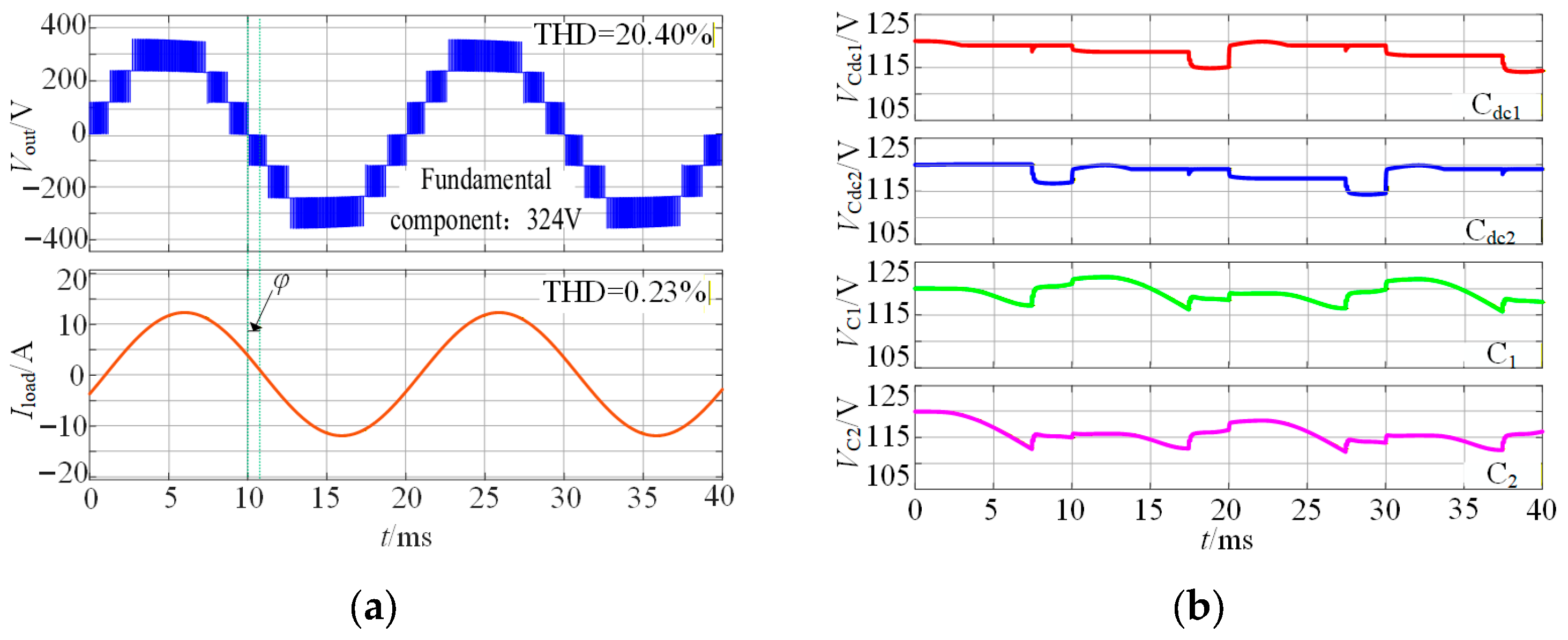 - Khodaparast, A.; Hassani, M.J.; Azimi, E.; Adabi, M.E.; Adabi, J.; Pouresmaeil, E. Circuit conFigureuration and modulation of a seven-level switched-capacitor inverter. IEEE Trans. Power Electron. 2021, 36, 7087–7096. [Google Scholar] [CrossRef]