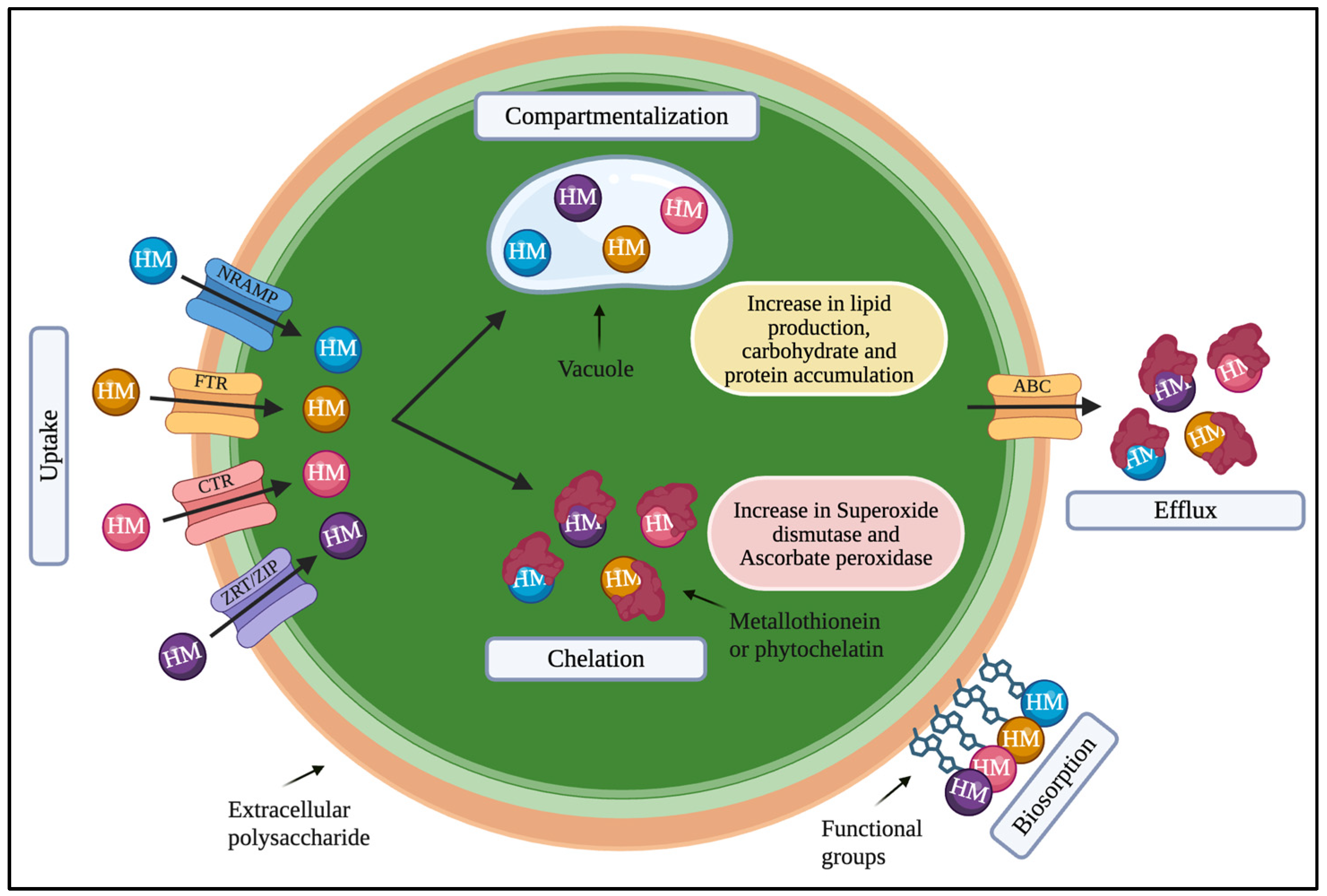 - Priyadarshini, E.; Priyadarshini, S.S.; Pradhan, N. Heavy metal resistance in algae and its application for metal nanoparticle synthesis. Appl. Microbiol. Biotechnol. 2019, 103, 3297–3316. [Google Scholar] [CrossRef]