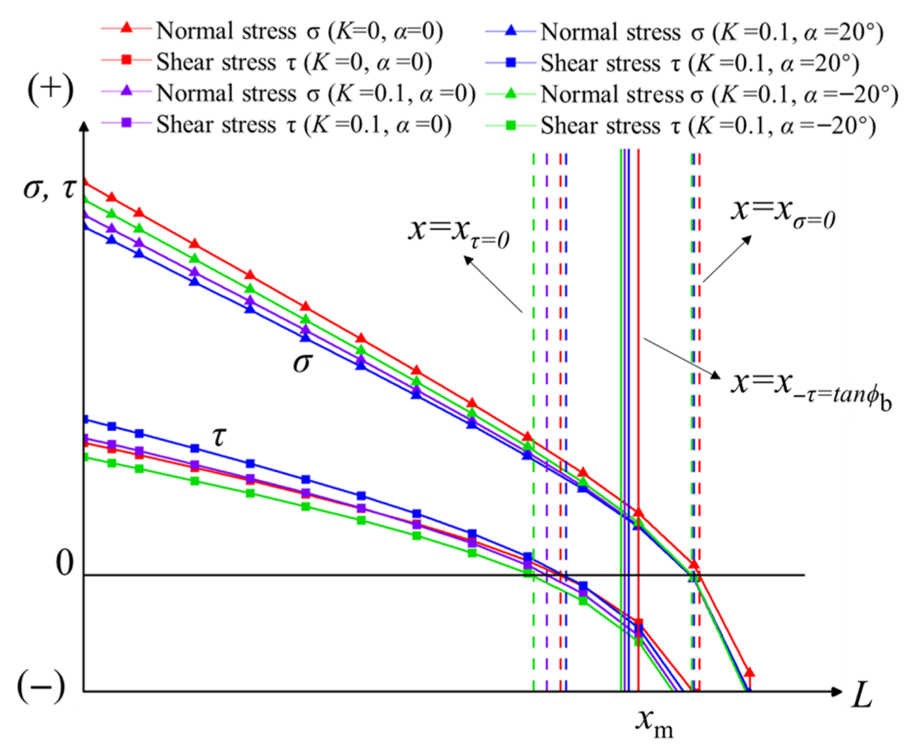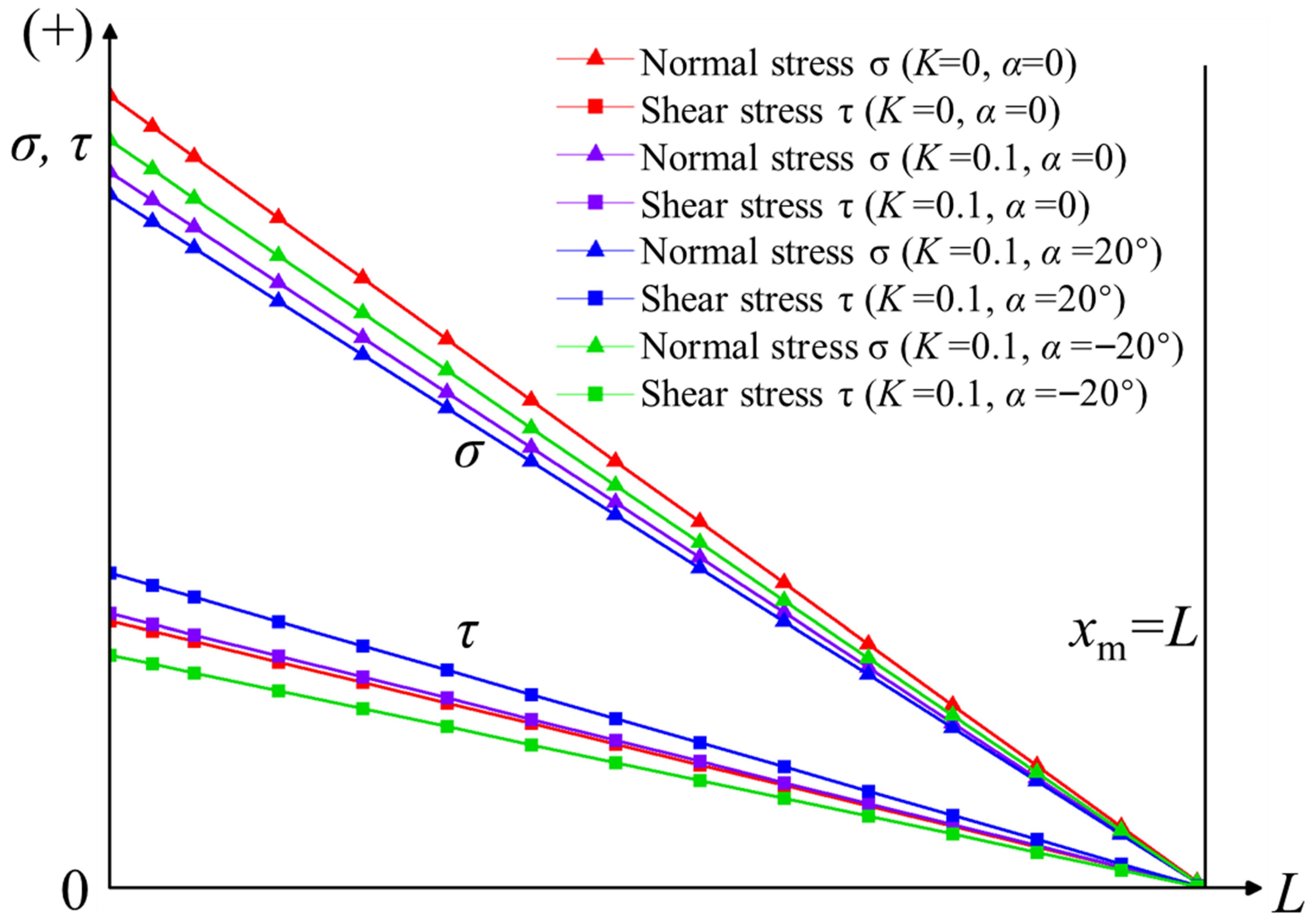 As. It can be observed that the normal and shear stresses gradually decrease with increases in the abscissa value, and that the value of the shear stress turns negative earlier than the value of the normal stress. Before the normal stress reaches zero, therefore, there must be a critical point that satisfies −