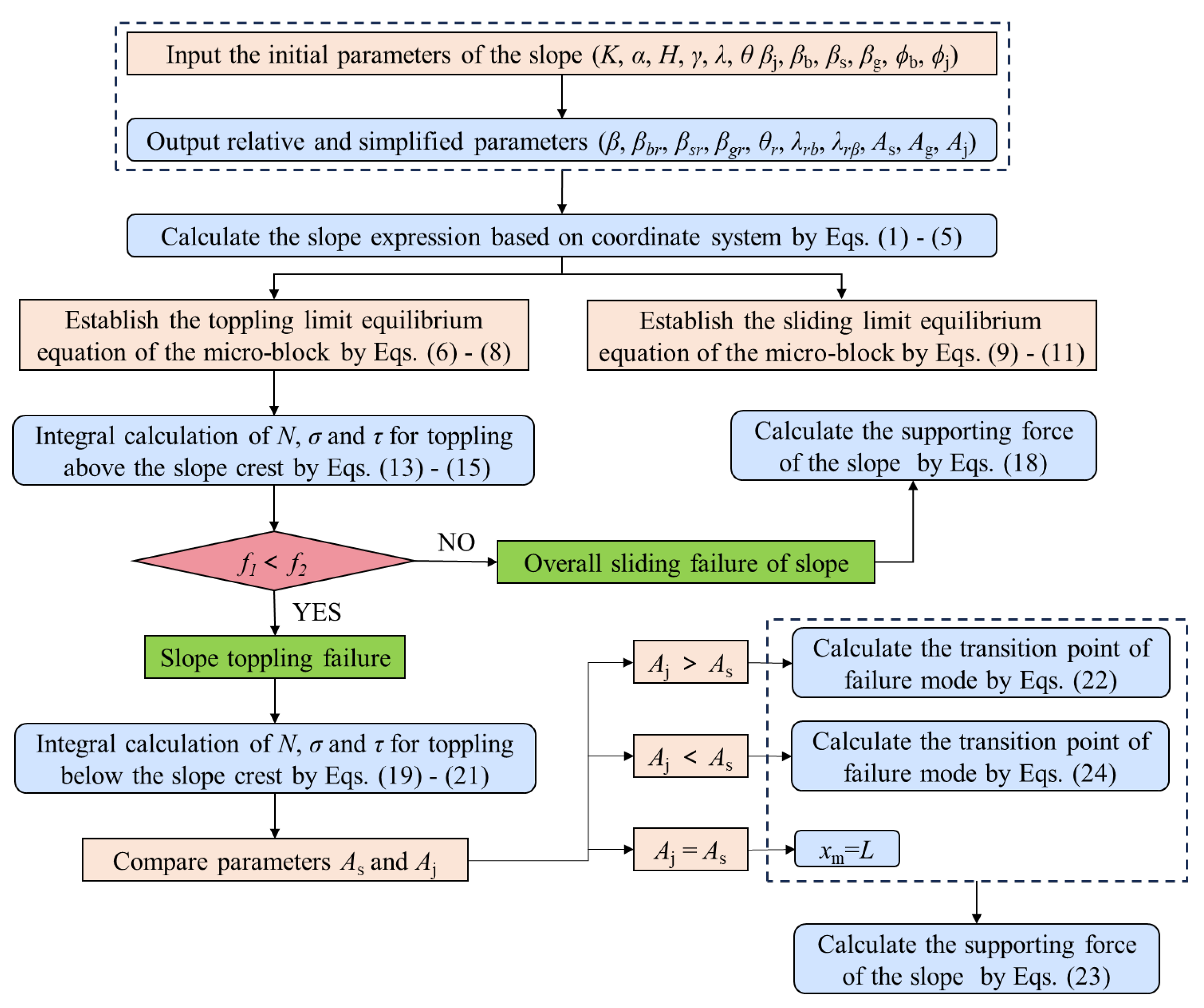 (1) The developed method proposes a judge criterion for the failure mode of rock slopes, and gives the calculation equation of the transition point abscissa of the micro-block from toppling to sliding.