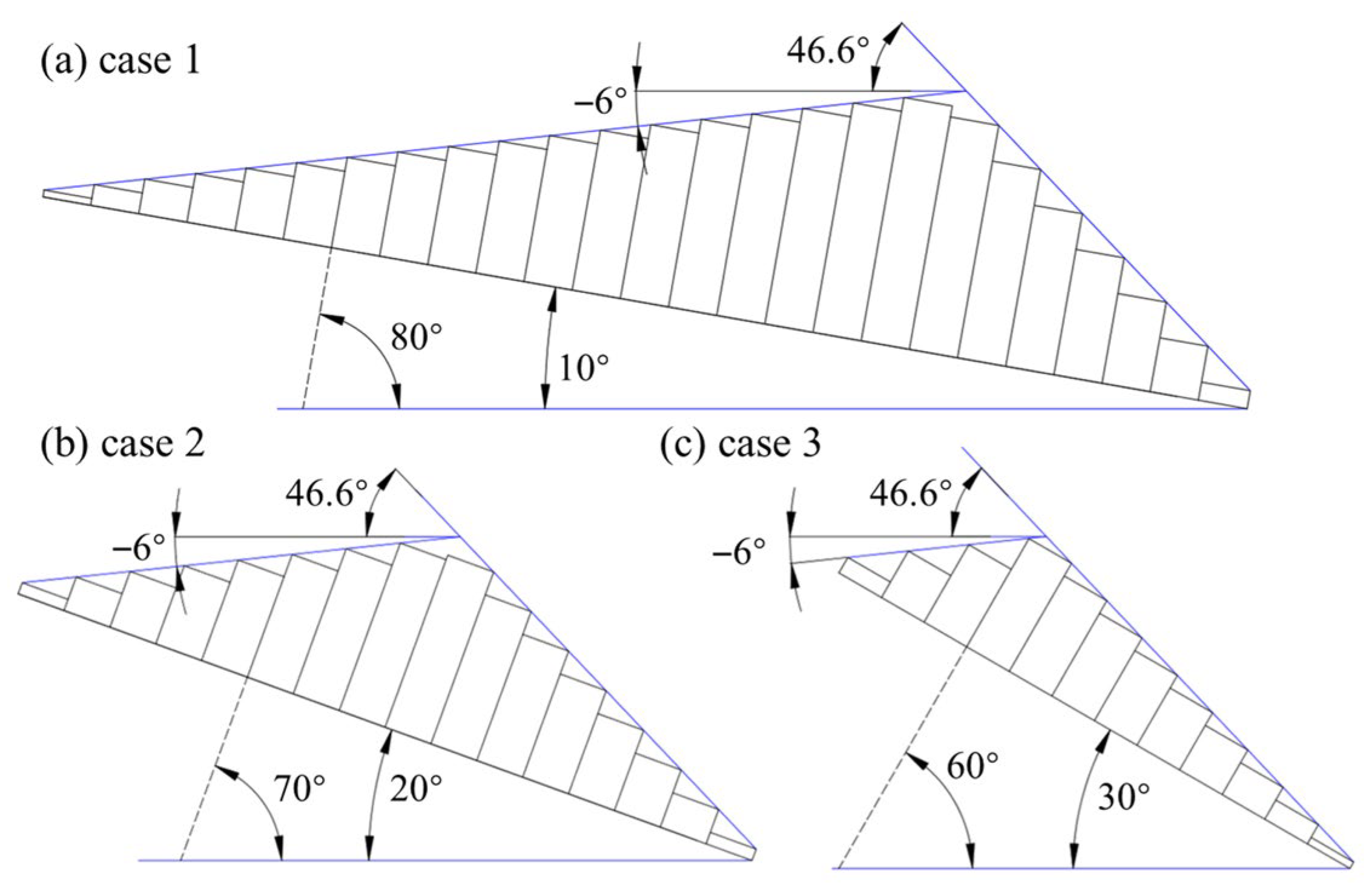 38] improved the solution and pointed out that the transition position at which rock blocks convert from toppling to sliding should be determined through the application of the limit friction equilibrium condition at the block base. Currently, no scholars have calculated the toppling stability of slopes with non-orthogonal structural plane blocks under seismic loads by pseudo-continuous medium methods.