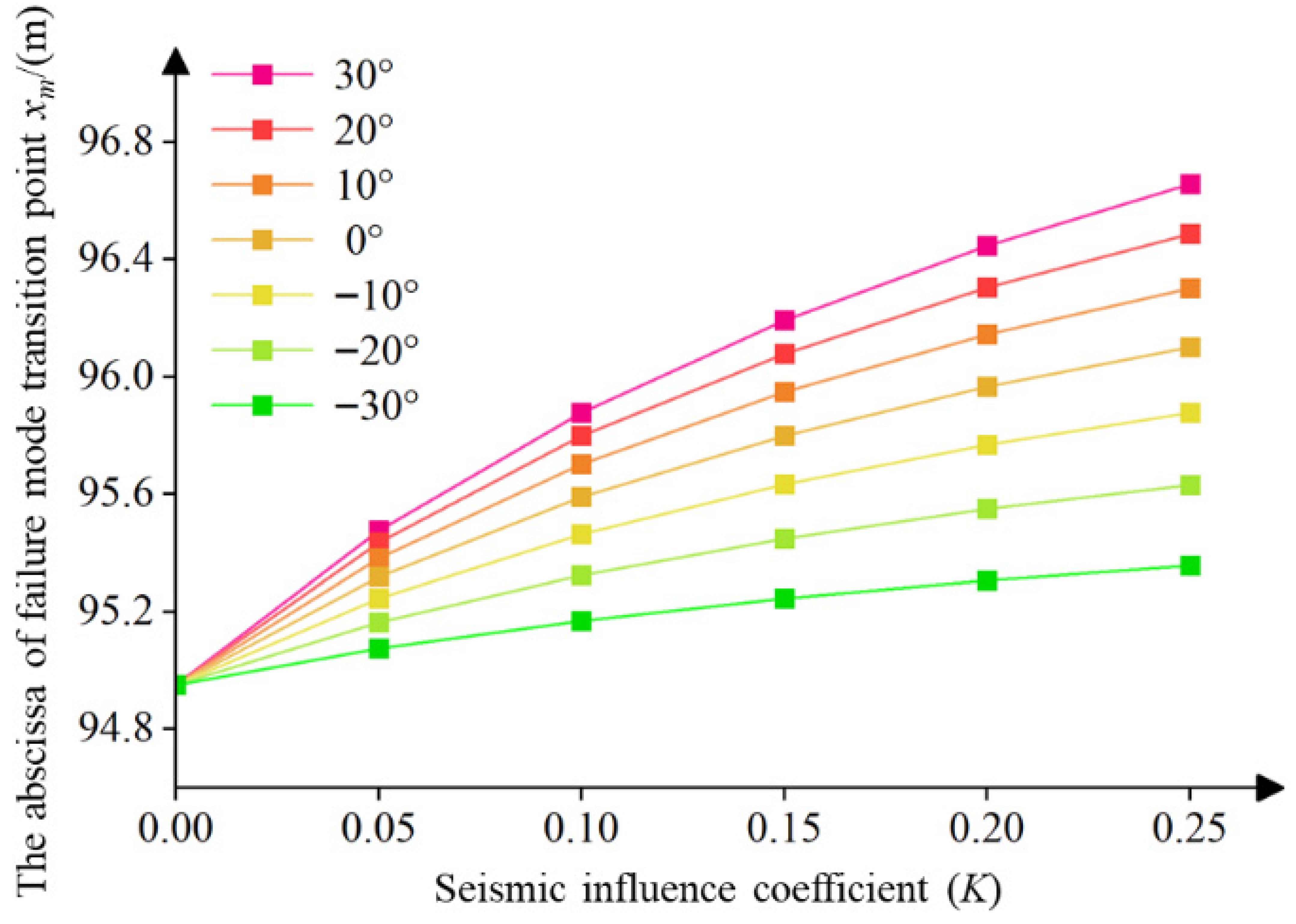 Figure 14 shows the relationship between the seismic influence coefficient and the transition position of the failure mode of the micro-block. It can be observed that with increasing K values, the value of xm increases, indicating that the transition position of the failure mode moves to the slope toe. When K increases from 0 to 0.25, the positions of xm corresponding to the angle between the direction of the seismic load and the horizontal plane, α, of 30° and −30° change from 94.95 m to 96.66 m and 95.35 m, respectively, increasing by 1.8% and 0.42%, indicating that when α < 0, the seismic action has a greater impact on slope stability.