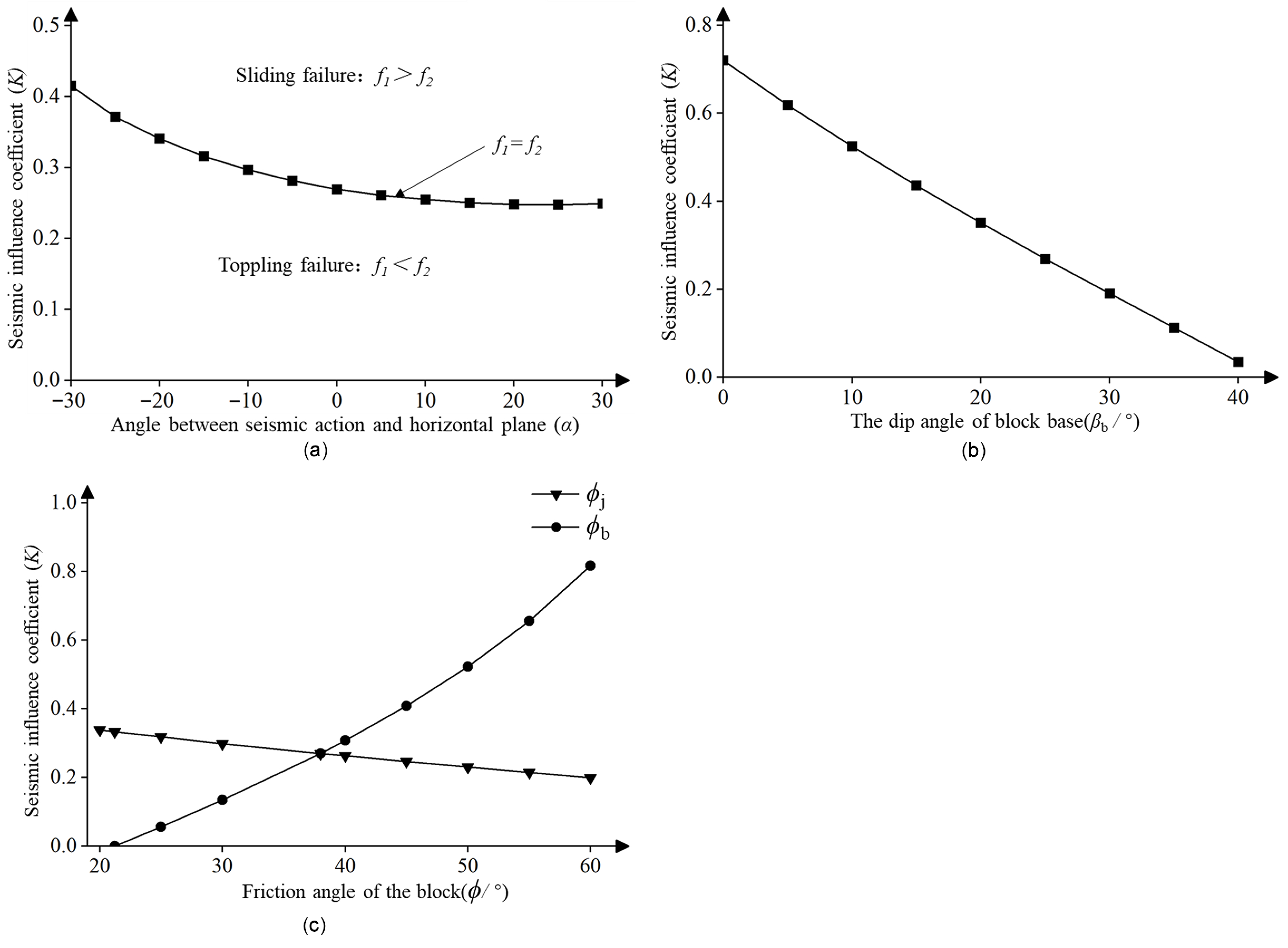 (3) The critical seismic influence coefficient, Kcr, is positively correlated with the friction angle of the block base, but negatively correlated with the friction angle of the block sides, and the angle between the seismic load and the horizontal plane and the dip angle of block base. When the seismic influence coefficient reaches the critical value, the slope will slide as a whole rather than topple.