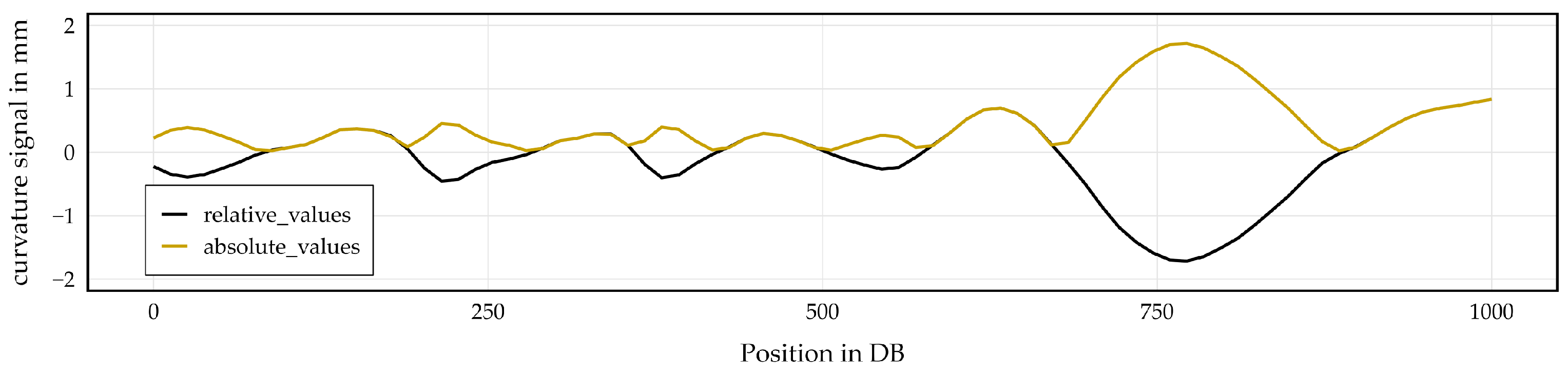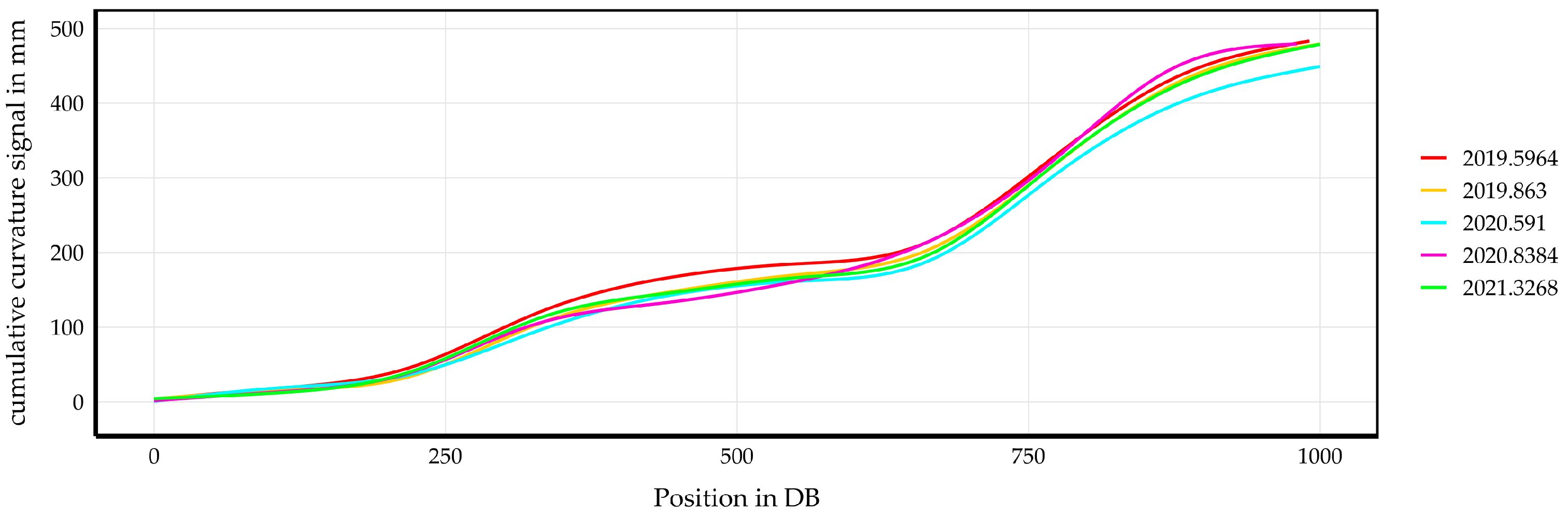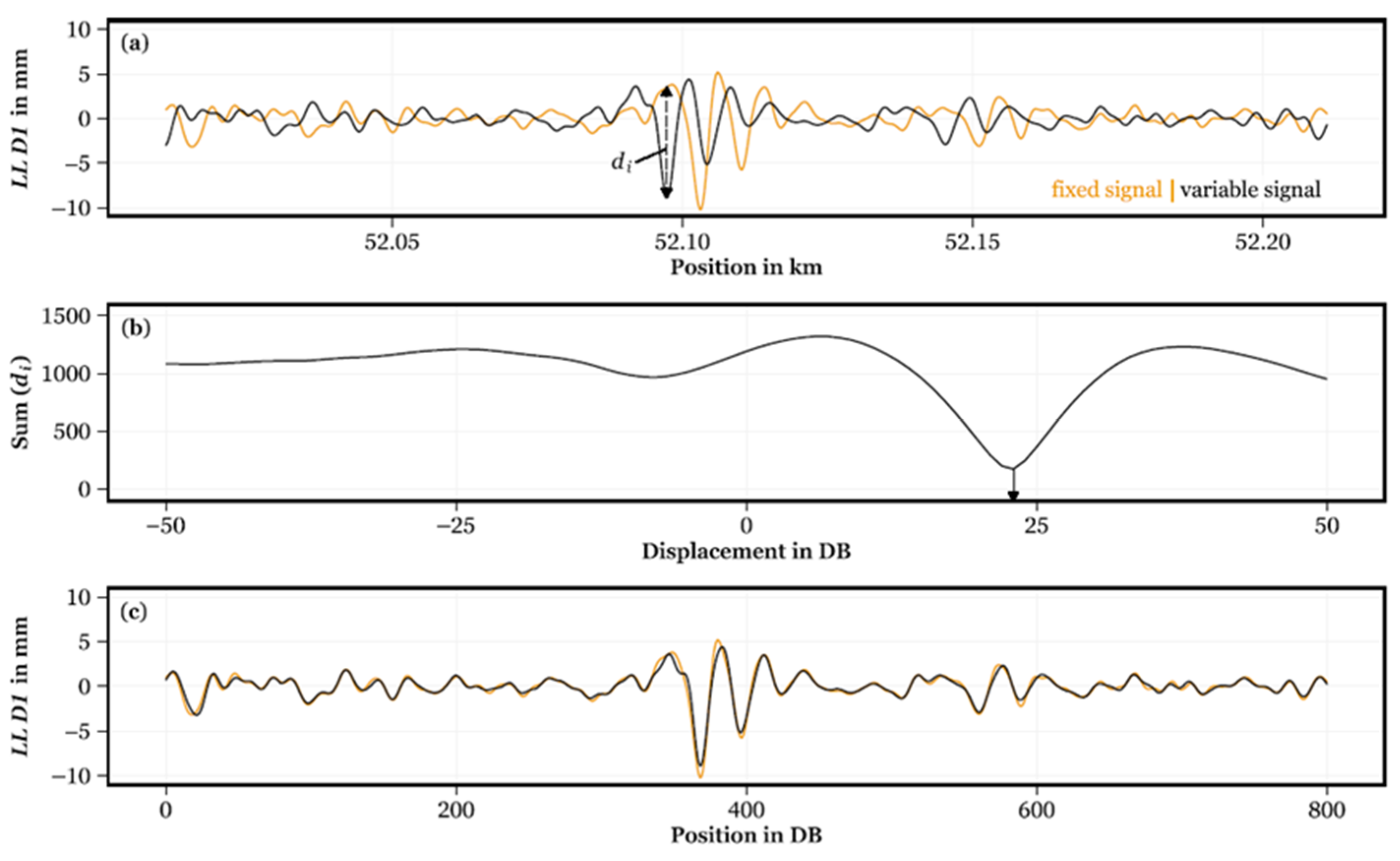 - Local adjustment: The signal is divided into consecutive 200 m segments, each of which is adjusted individually with a maximum shift of 0.25 m to correct for local stretching or compression.