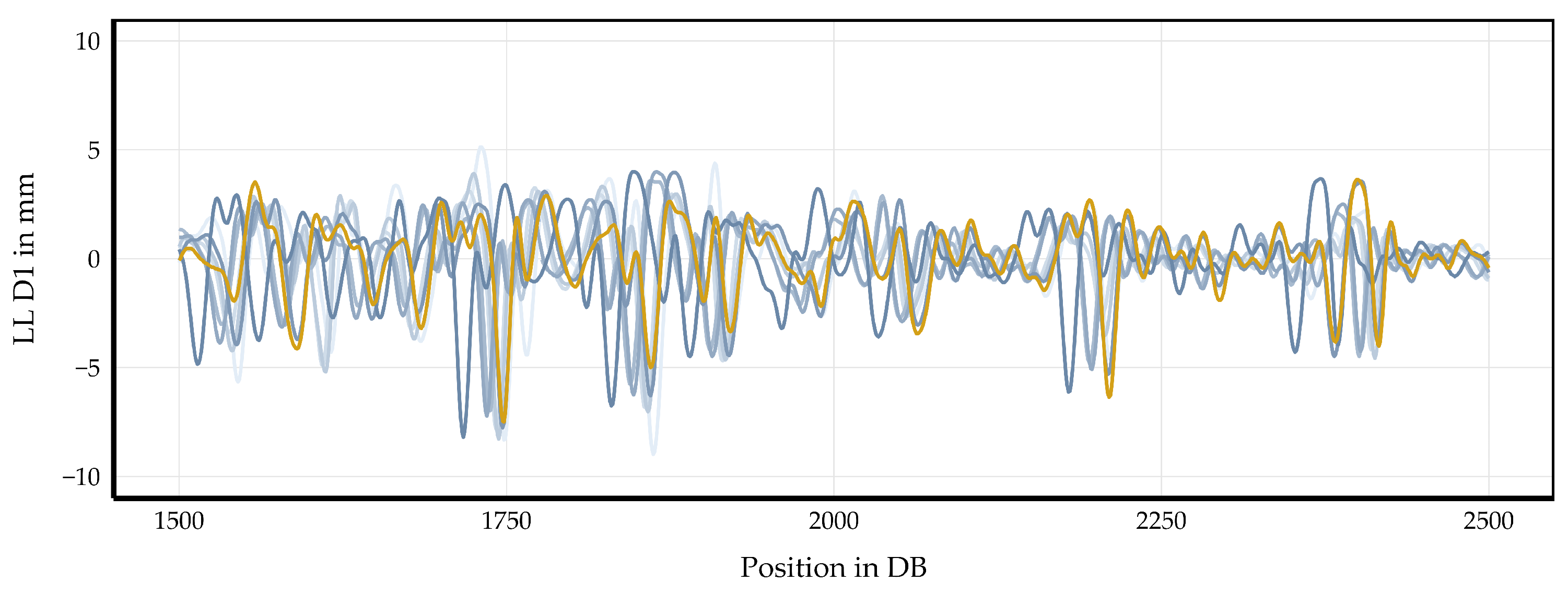 - ÖNORM EN 13848-1:2018; Railway Applications–Track–Track Geometry Quality–Part 1: Characterization of Track Geometry. Austrian Standards International (ASI): Vienna, Austria, 2018.