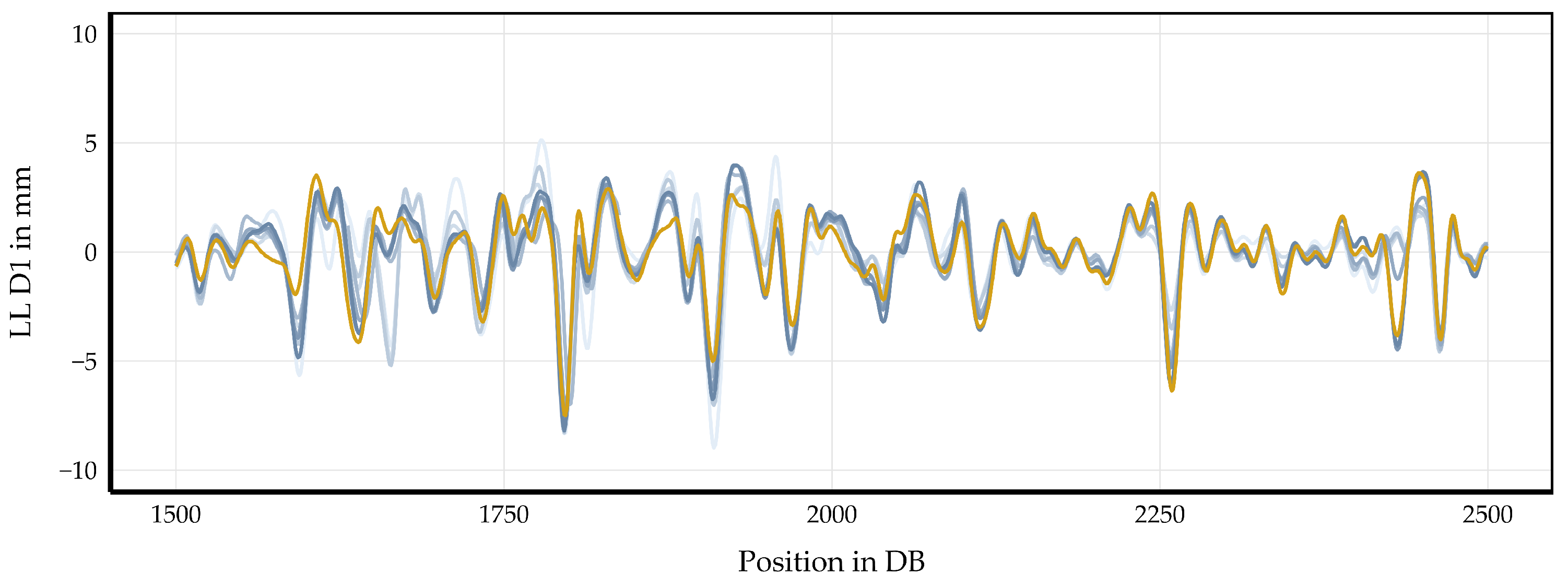 - Focused synchronization: The signal is conceptually divided into three equal parts, and the Euclidean distance is computed for the central 333 m around the crossing nose. Based on this, the signal is adjusted with a maximum displacement of 10 m.