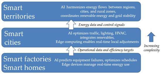 In smart factories, AI-based data analytics process data streams from machine sensors, predicting equipment failures and enabling predictive maintenance that reduces unnecessary energy waste [11]. Real-time AI-based optimization of production and machine schedules at the grid edge minimizes downtime and adjusts energy consumption to meet demand peaks [12,13]. In smart cities, AI-based traffic and lighting systems analyze mobility patterns to reduce congestion and dynamically adjust street lighting, reducing electricity consumption. Edge computing enables these changes to be implemented locally, providing a rapid response to changes in real time without overloading central servers [14,15]. Urban HVAC and heating systems use AI predictions to balance comfort and efficiency by integrating renewable energy sources such as solar and wind. In smart territories—large, interconnected regions—AI analytics harmonizes energy flows between cities, industrial zones, and rural areas to prevent congestion and optimize grid stability [16]. Edge computing in remote areas enables local decision-making, enabling rural energy microgrids to operate autonomously while coordinating with central systems [17]. Predictive analytics in these areas supports better integration of renewable energy, reducing variability and maximizing green energy utilization [18]. By processing data locally, edge computing reduces communication latency and bandwidth requirements, which are essential for optimizing energy consumption at scale [19,20]. Together, AI-based analytics and edge computing create a layer of distributed intelligence that transforms smart environments into adaptive, energy-efficient ecosystems (Figure 2) [21,22].
