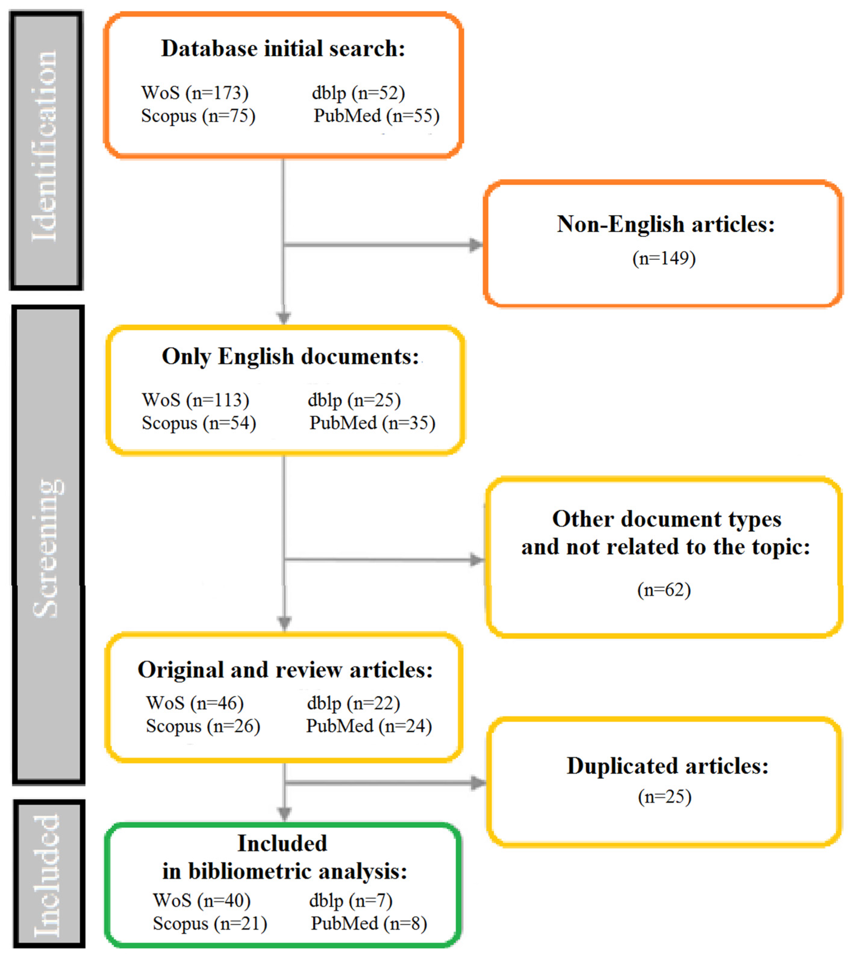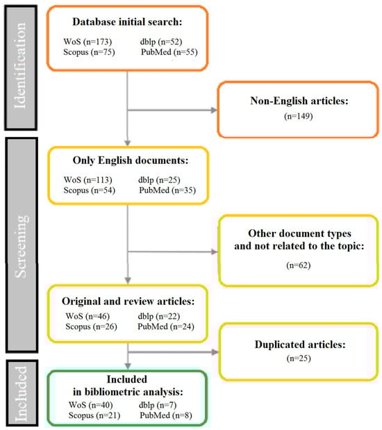 This research employed a structured and purpose-driven search across four major bibliographic databases: Web of Science (WoS), Scopus, PubMed, and DBLP. Using this combination ensured the broadest possible coverage of relevant studies and provided a rich body of globally significant data for advancing knowledge and its practical applications (Figure 4 and Figure 5). To efficiently identify the most relevant records, suitable filters were applied, limiting the results to English-language publications. Following this initial screening, each article was independently reassessed by three experts to confirm compliance with the inclusion criteria, thereby establishing the final dataset. The dataset was then examined with respect to its key attributes, such as the most prominent authors and research groups, affiliated institutions, countries of origin, sources of funding (when reported), scientific disciplines, and subject categories. This analysis enabled the identification of major research contributions within the field and the detection of emerging trends, some of which diverged from initial expectations. Where feasible, temporal patterns were analyzed to observe how the field has evolved over time, and publications were organized into thematic clusters to uncover connections among different research domains. This approach brought to light significant themes and subareas, including those that are still in the early stages of development.