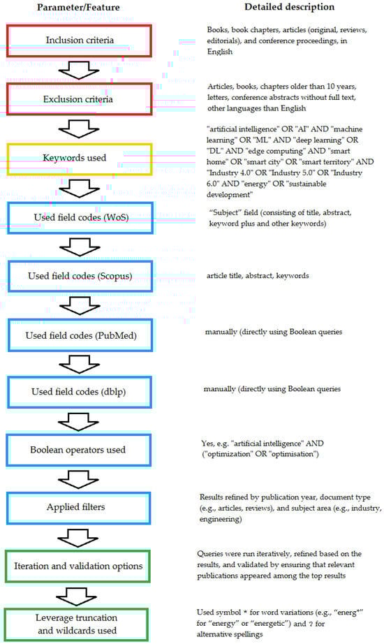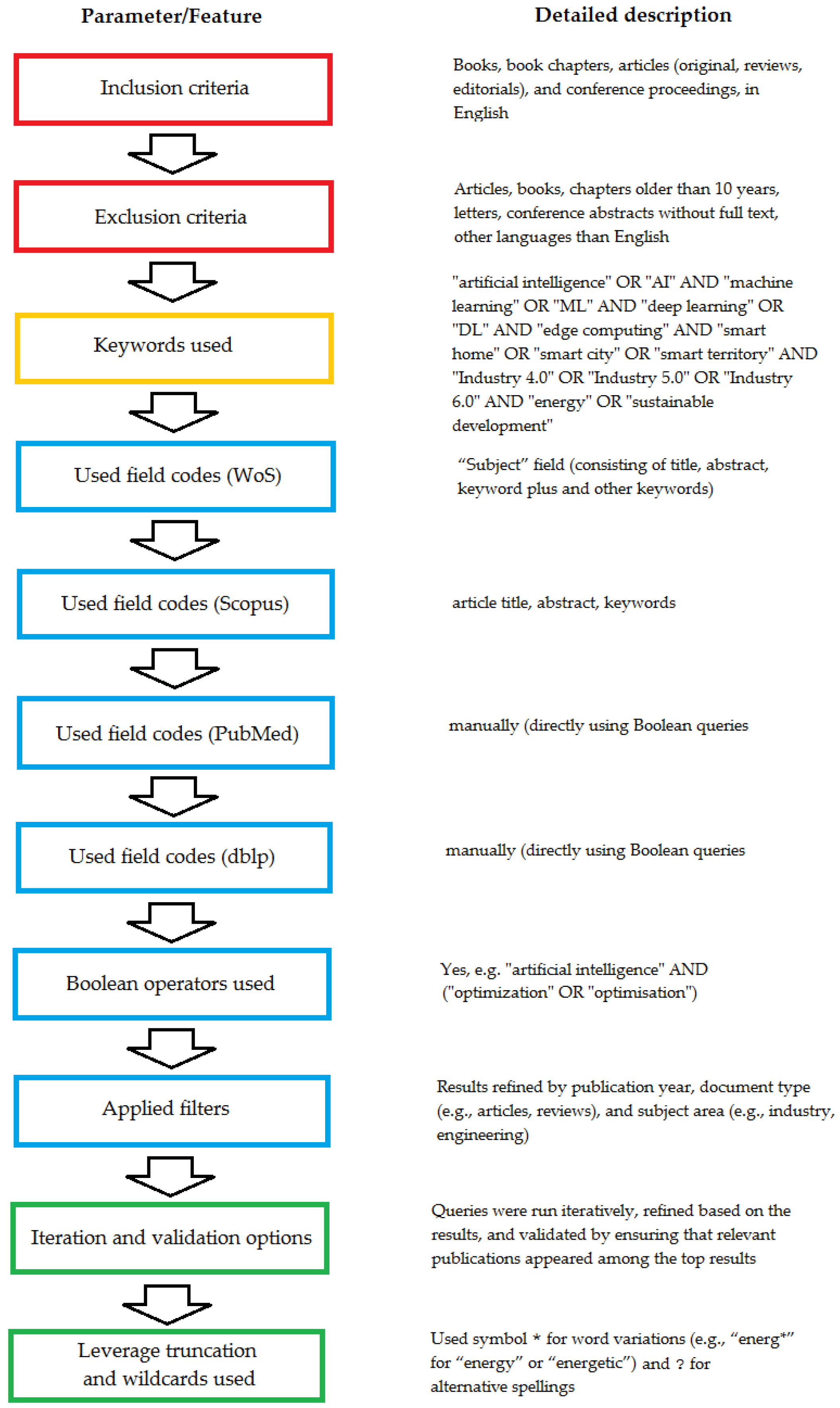 Across all databases, articles were retrieved using keywords such as “artificial intelligence” OR “AI,”“machine learning” OR “ML,”“deep learning” OR “DL” AND “edge computing” AND “smart home” OR “smart city” OR “smart territory” AND “Industry 4.0” OR “Industry 5.0” OR “Industry 6.0” AND “energy” OR “sustainable development” (Figure 6).