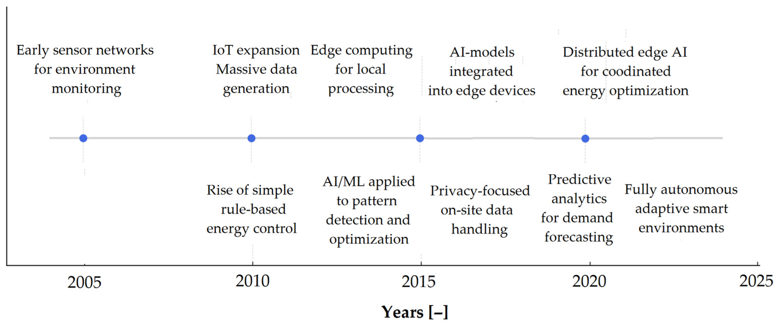 The genesis of artificial intelligence (AI)-based data analytics in smart environments began with the growing availability of sensor networks capable of monitoring temperature, lighting, occupancy, and energy consumption in real time [1]. Early systems relied on simple rule-based control, but the explosion of Internet of Things (IoT) devices in the 2010s created massive, complex datasets that required more advanced analysis [2]. AI and machine learning (ML) have become powerful tools for detecting patterns, predicting consumption trends, and optimizing resource allocation, beyond the capabilities of static algorithms [3]. Simultaneously, the need for faster decision-making and lower data transmission costs has spurred the development of edge computing, where processing occurs closer to the data source [4]. This local processing not only reduced network latency but also improved privacy by storing sensitive building and occupancy data on-site [5,6]. Researchers have begun integrating AI models with edge devices, enabling smart meters, heating, ventilation, and air conditioning (HVAC) controllers, and lighting systems to autonomously adjust settings in real time [7]. Predictive analytics has become a cornerstone, enabling systems to forecast demand peaks, adjust load schedules, and more efficiently integrate renewable energy sources [8]. Edge AI has further enabled distributed coordination between devices, supporting swarm-level energy optimization across entire smart campuses or districts [9,10]. The synergy between AI-based analytics and edge computing has transformed energy management from a centralized, reactive process to a decentralized, proactive ecosystem [11]. Today, this combination is powering next-generation smart environments that combine comfort, savings, and sustainability through continuous, intelligent adaptation (Figure 1). This also creates new opportunities for the future, which will be discussed in more detail later in this article.