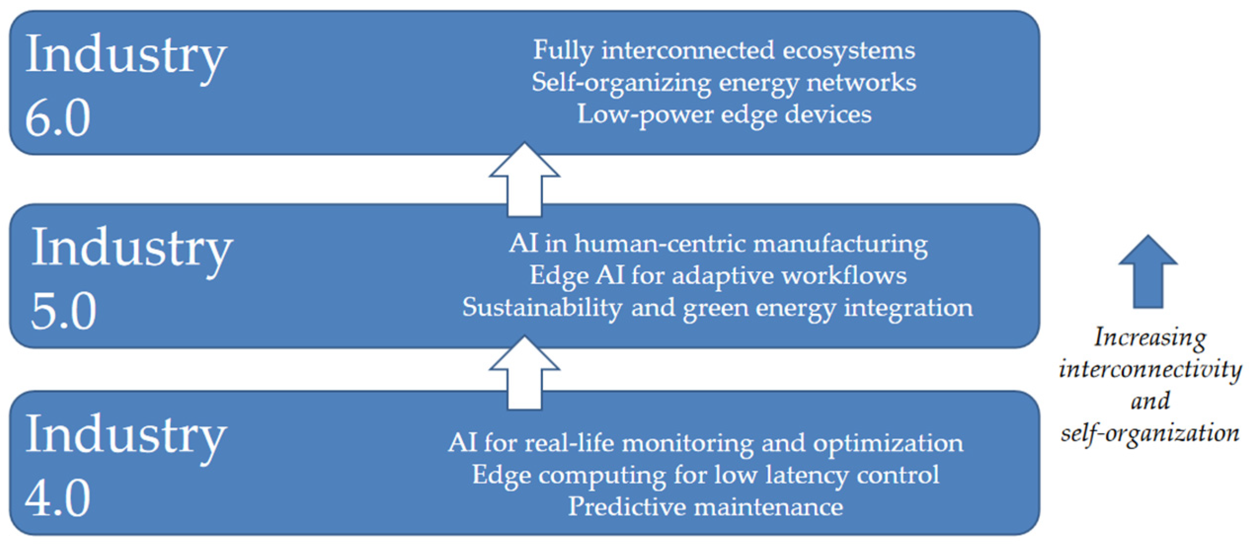 In Industry 4.0, AI-based data analysis enables real-time monitoring of industrial processes, identifying inefficiencies, and optimizing machine operation to reduce energy consumption [23,24]. Edge computing in this paradigm supports rapid decision-making directly on the shop floor, minimizing latency and grid dependence for energy control. AI-based predictive maintenance reduces downtime and prevents energy waste caused by faulty or inefficient equipment [25,26]. As we transition to Industry 5.0, AI-based energy optimization is expanding to human-centric production, where collaborative robots adapt their operations to human work rhythms and reduce idle energy consumption [27]. Edge AI enables local decision-making in hybrid human–machine processes, enabling more adaptive and personalized energy-saving strategies [28]. AI analytics in Industry 5.0 also integrates sustainability goals, dynamically balancing productivity with environmental impact by prioritizing green energy [29,30]. In the emerging vision of Industry 6.0, AI and edge computing operate within fully connected ecosystems of factories, cities, and territories, sharing real-time energy information [31]. This paradigm leverages self-organizing networks of machines and infrastructure that autonomously negotiate energy consumption based on global and local demand [32]. Low-power edge devices in Industry 6.0 may enable massive, near-instantaneous optimization of distributed energy systems [33,34]. In all three paradigms, the synergy of AI-based analytics and edge computing shifts energy management from static, reactive control to a dynamic, self-optimizing system that supports resilience, sustainability, and efficiency [35]. Evolution of AI and edge computing roles from Industry 4.0 to Industry 6.0, highlights the shift from real-time optimization and predictive maintenance to fully interconnected, self-organizing energy ecosystems (Figure 3).