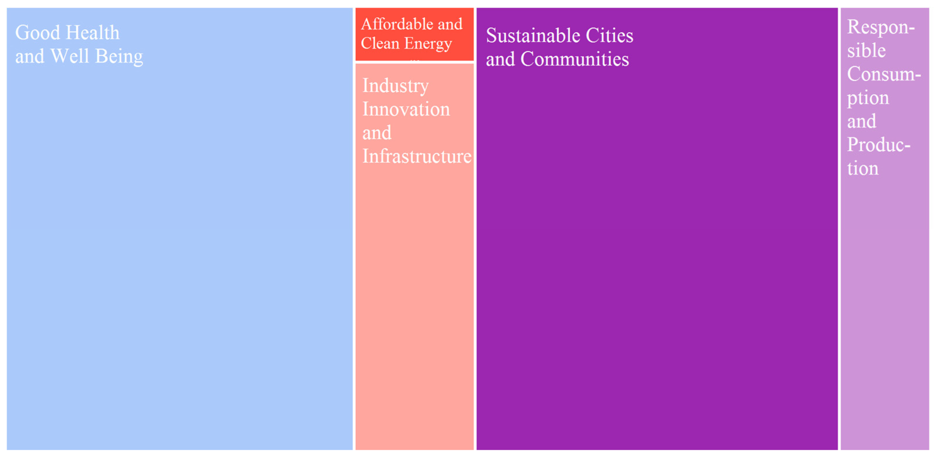 Sustainable Cities and Communities (43.64%), Good Health and Well Being (41.82%)