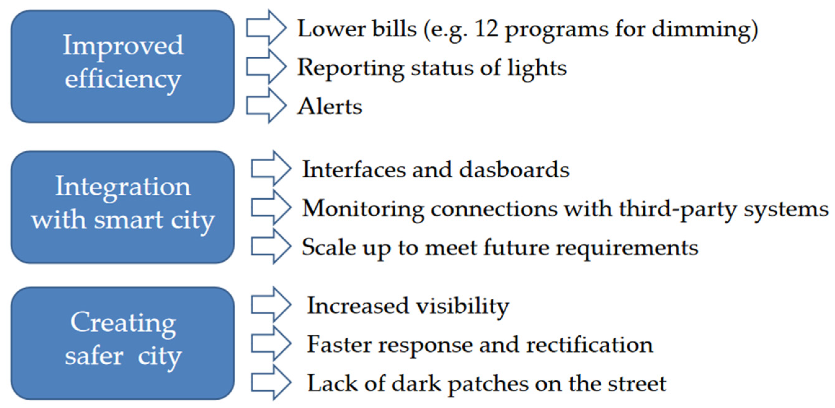 We have selected case studies that demonstrate how IoT, along with edge computing and AI-powered data analytics, has significantly improved energy efficiency in various smart environments (data centers, buildings, campuses, streets, power grids, and heating, ventilation, and air conditioning systems). Google (Mountain View, CA, USA) used deep learning (DeepMind) models trained on historical telemetry data (temperatures, energy consumption, cooling controls) and integrated real-time predictions with control systems to adjust chiller/ventilation unit setpoints in the data center. The AI worked in a tight loop with the facility’s control systems (cloud/edge integration). Google reported approximately a 40% reduction in cooling energy consumption and an overall total energy reduction of approximately 15%. These savings resulted from predictive control and more efficient fan/chiller operation. This demonstrated that high-resolution sensor telemetry combined with ML predictions can detect non-intuitive control actions. However, this requires tight integration with operational controls and strict adherence to safety constraints [71]. Signify (Einhoven, The Netherlands)/Philips (Amsterdam, The Netherlands) smart street lighting implementations in Pune and Bratislava. These cities replaced old lamps with LED luminaires equipped with IoT controllers and managed by a city-wide platform (group dimming, scheduling, and fault monitoring). Edge/IoT nodes provide local dimming and status monitoring, while the city platform performs analytics for scheduling and fault detection. These case studies demonstrate significant savings: up to approximately 40% electricity savings through group dimming and LED conversion, as well as annual electricity savings, CO2 emissions reduction, and operational savings. These studies demonstrate that replacing the LED hardware and adding IoT controllers delivers immediate energy savings, while analytics enable further savings through adaptive dimming while streamlining maintenance (fewer service visits, Figure 14) [72].