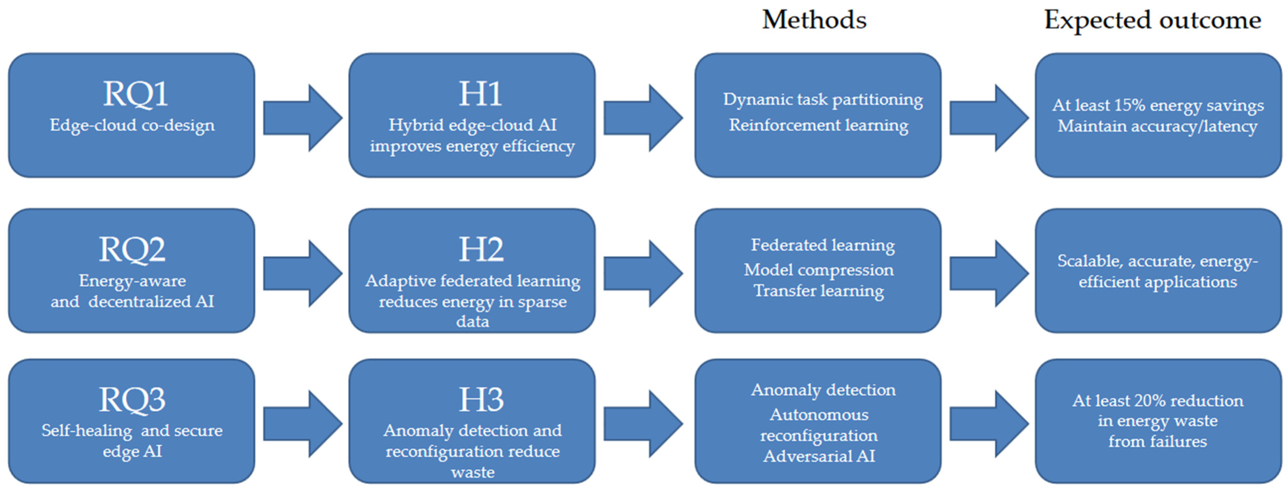 • H3: Embedding anomaly detection and autonomous reconfiguration mechanisms into edge AI systems will increase fault tolerance and cybersecurity, thereby reducing energy losses due to failures or attacks by at least 20% compared to conventional edge deployments.