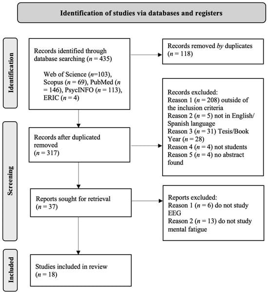 The inclusion criteria for this review were defined using the PICOS framework (Population, Intervention, Comparison, Outcome, and Study Design) to ensure a systematic and structured approach [46]. Studies were considered eligible if they met the following conditions: (1) Population: participants were students from primary, secondary, university or higher educational levels; (2) Intervention: studies included measures related to mental fatigue, such as mental exertion, cognitive fatigue, emotional exhaustion, or ego depletion; (3) Comparison: not applicable; (4) Outcome: studies assessed mental fatigue levels within educational contexts (operationally defined as primary, secondary, or tertiary education settings involving classroom activities, academic assignments, or educationally relevant cognitive tasks) using continuous EEG measurements (defined as sustained EEG recordings during task performance, as opposed to event-related potentials derived exclusively from discrete, time-locked stimuli), and specifically addressed mental fatigue as a primary or secondary research objective; and (5) Study Design: the review included qualitative, descriptive, correlational, longitudinal, experimental, and cross-sectional studies. To be included in the review, studies had to be published between 2000 and August 2024.