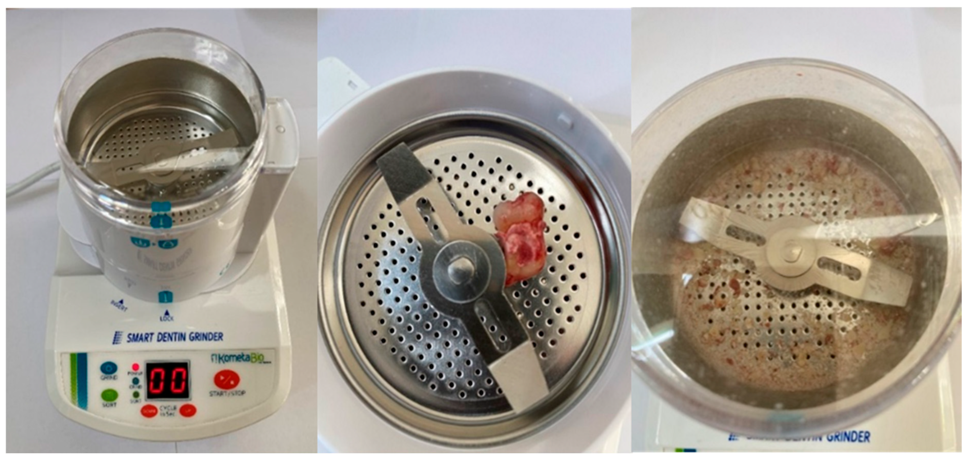 - Olchowy, A.; Olchowy, C.; Zawiślak, I.; Matys, J.; Dobrzyński, M. Revolutionizing Bone Regeneration with Grinder-Based Dentin Biomaterial: A Systematic Review. Int. J. Mol. Sci. 2024, 25, 9583. [Google Scholar] [CrossRef]