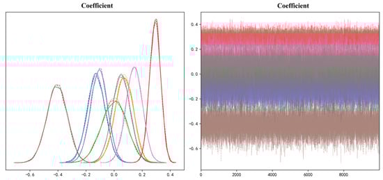 Based on the significant built environment factors identified in the initial Poisson Regression analysis, this study further employed a Bayesian Poisson Regression (BPR) model to improve parameter estimation robustness. Modeling was implemented via PyMC3, with posterior analysis conducted using ArviZ. Weakly informative priors were specified, with the constant term β0~N (0, 52) and explanatory variable coefficients βᵢ~N (0, 22), which avoids prior dominance over the data while providing regularization to stabilize estimates in our small sample. MCMC sampling was configured with three chains, each consisting of 2000 burn-in iterations and 10,000 sampling iterations, resulting in a total of 30,000 samples. Convergence was validated using R-hat (<1.01) (Table 6), effective sample size (ESS > 1000), and trace plots (Figure 5), indicating good model convergence. Predictive accuracy was evaluated using WAIC (493.2352 ± 68.1078). Regression coefficients from both the Standard Poisson Regression (SPR) and the Bayesian Poisson Regression (BPR) models exhibited strong agreement, validating the initial findings. Compared to the SPR model, the BPR model exhibits smaller standard deviations for built environment variables. A smaller standard deviation indicates more precise coefficient estimates, suggesting that the sample data provides stronger support for the association coefficients between built environment variables and elderly pedestrian accident risk. Conversely, a larger standard deviation implies greater uncertainty in the coefficient estimates, potentially leading to less stable results. Therefore, the results of the Bayesian Poisson Regression (BPR) model are prioritized for subsequent mechanistic interpretation and policy impact analysis.