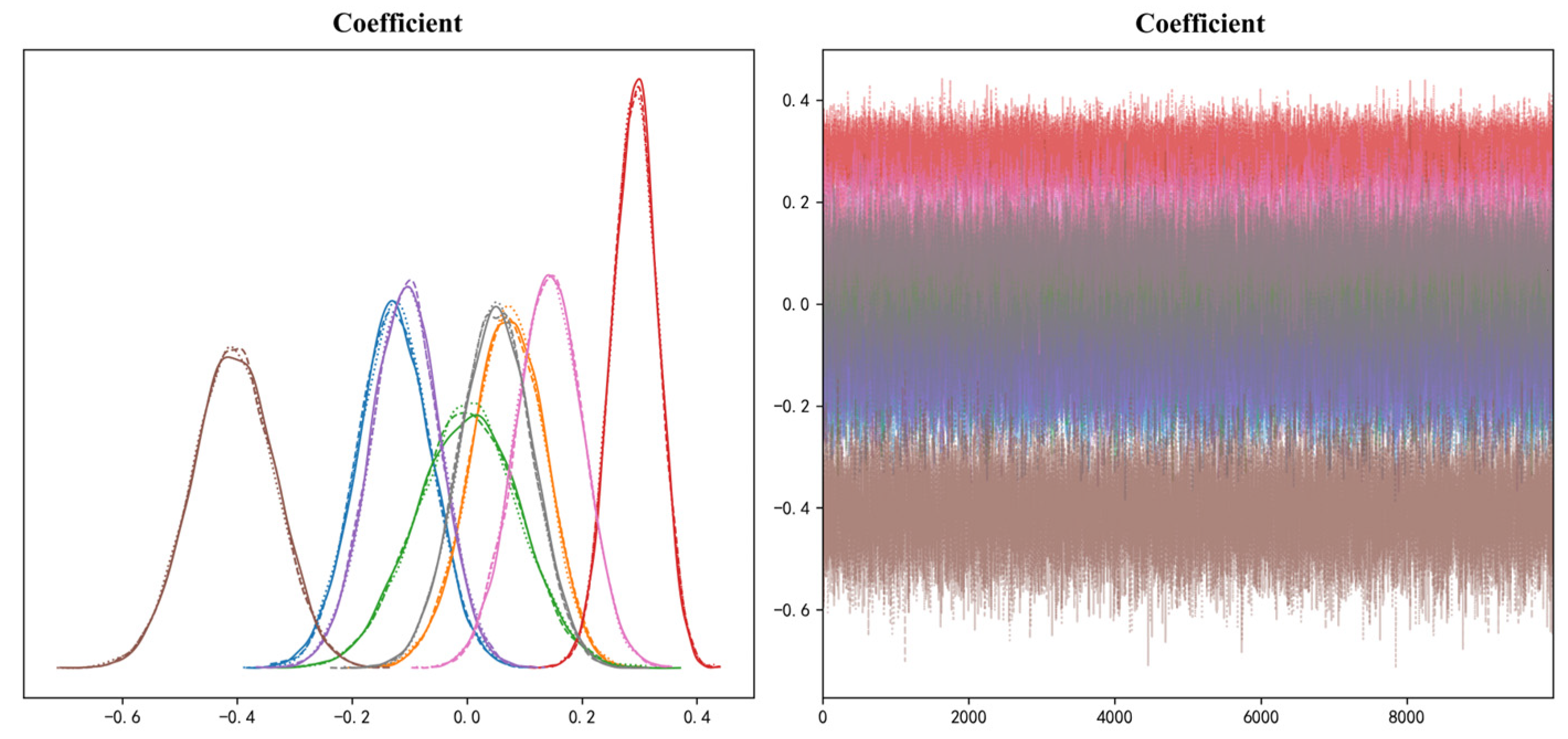 The prior specification was strictly implemented in PyMC3, with the intercept term assigned a normal prior with a mean of 0 and a variance of 52, while all slope coefficients were assigned normal priors with a mean of 0 and a variance of 22. This prior structure avoids over-constraining the intercept term and ensures full consistency between the mathematical formulation and the computational implementation.