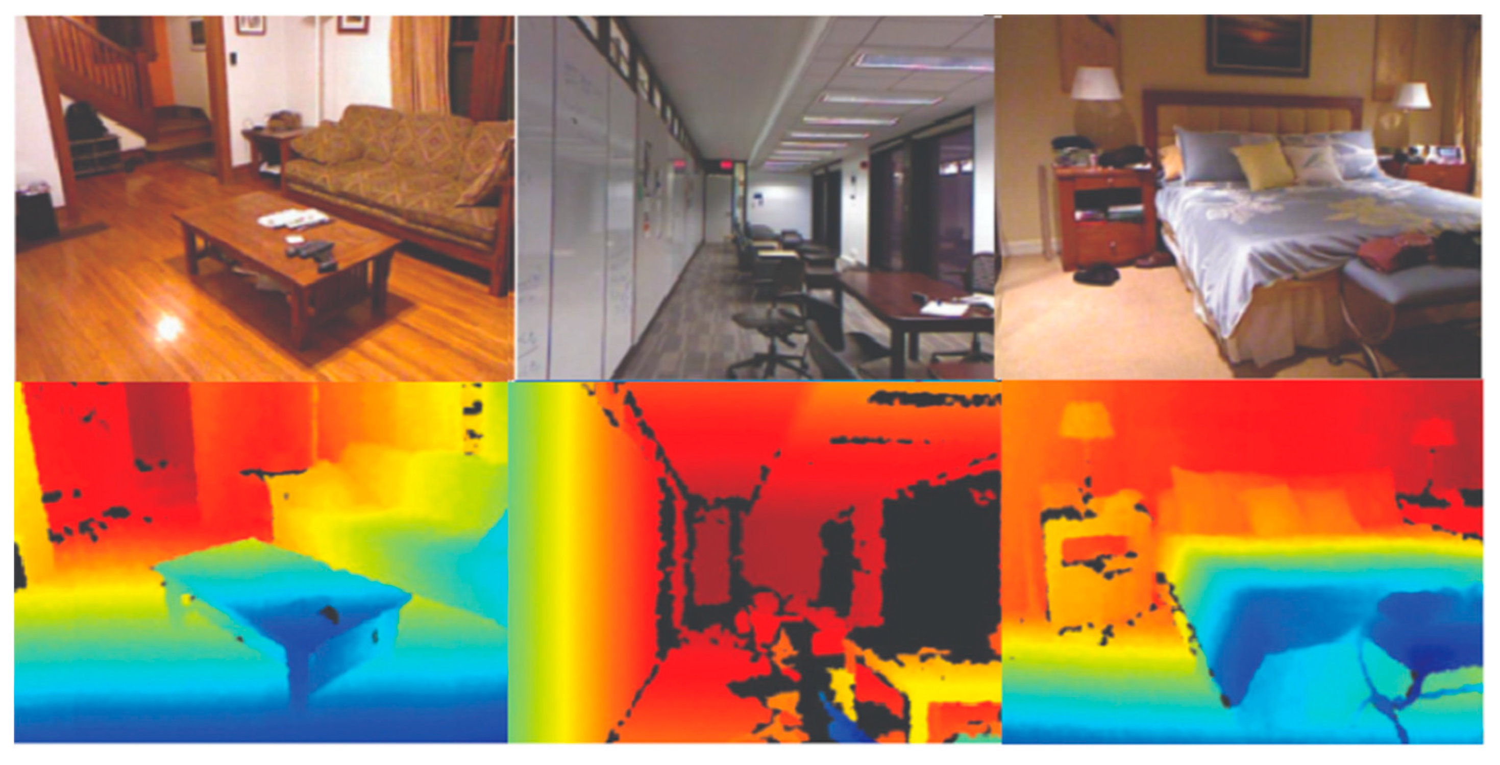 Representative samples from the NYU Depth V2 dataset. The top row displays the input RGB images of indoor scenes, while the bottom row shows the corresponding ground truth depth maps (visualized as heatmaps). These samples are used to evaluate the depth estimation branch of the proposed framework. In the depth maps, the color gradient represents distance from the camera, where blue indicates near objects and red indicates far objects.