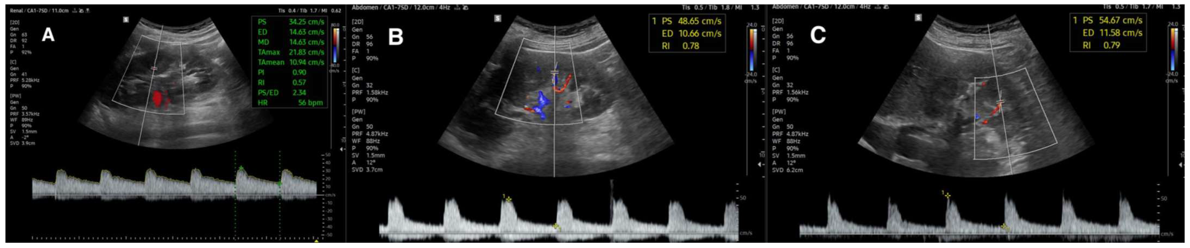 3.2.2. Peak Systolic Velocity and Renal–Aortic Ratio