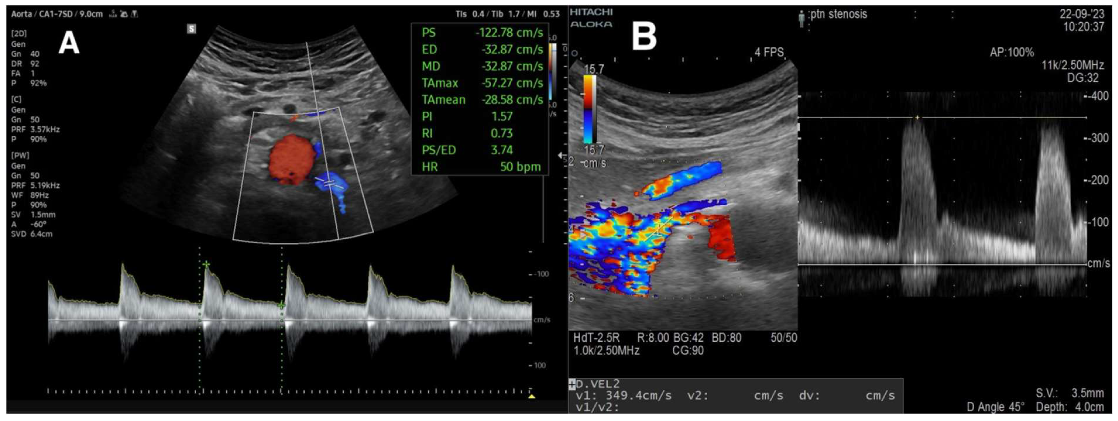 - Zhang, Y.; Wang, Y.; Ma, N.; Li, Y.; Li, Y.; Ren, J. Application of simple ultrasound Doppler hemodynamic parameters in the diagnosis of severe renal artery stenosis in routine clinical practice. Quant. Imaging Med. Surg. 2023, 13, 8042–8052. [Google Scholar] [CrossRef]