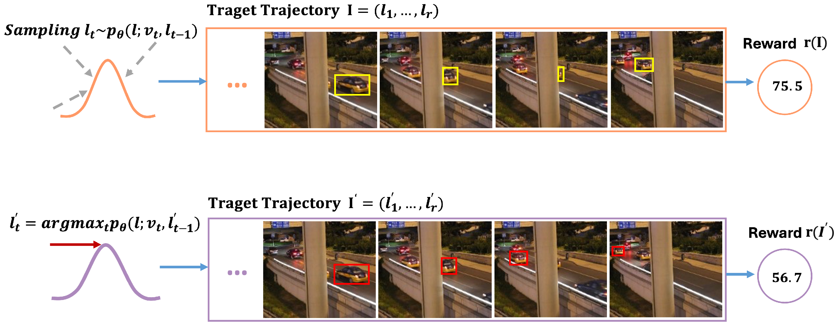 Figure 3, the proposed RL-based training strategy exhibits improved robustness under challenging conditions such as prolonged occlusion. When the target vehicle is fully occluded, the greedy tracker often mislocalizes nearby objects due to its reliance on maximum confidence scores. In contrast, the sampling strategy maintains exploration around previous estimates and successfully re-identifies the target after occlusion. In this scenario, a positive reward reinforces the sampling policy. Conversely, when the sampling strategy underperforms, a negative reward is applied to discourage suboptimal exploration.