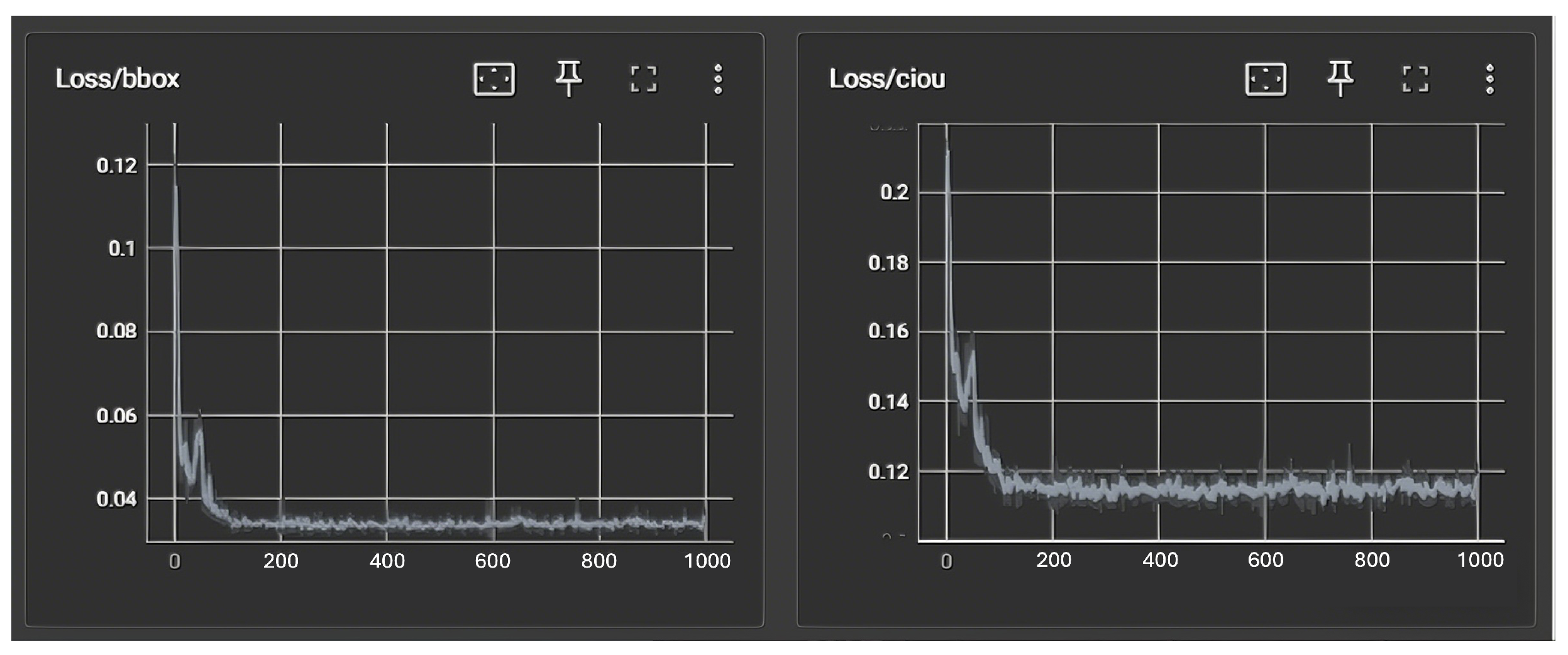 Figure 7. Both the bounding box regression loss (Loss/bbox) and the CIoU loss (Loss/ciou) show a steep decrease during the early training epochs, followed by a gradual stabilization phase. This behavior indicates that the proposed RL-based sequence-level training framework effectively captures spatial and temporal dependencies among consecutive frames. In the initial iterations, the model rapidly learns the fundamental geometric structures required for vehicle localization, while in the later stages, the losses converge smoothly to a stable minimum, demonstrating the stability of the training process.
