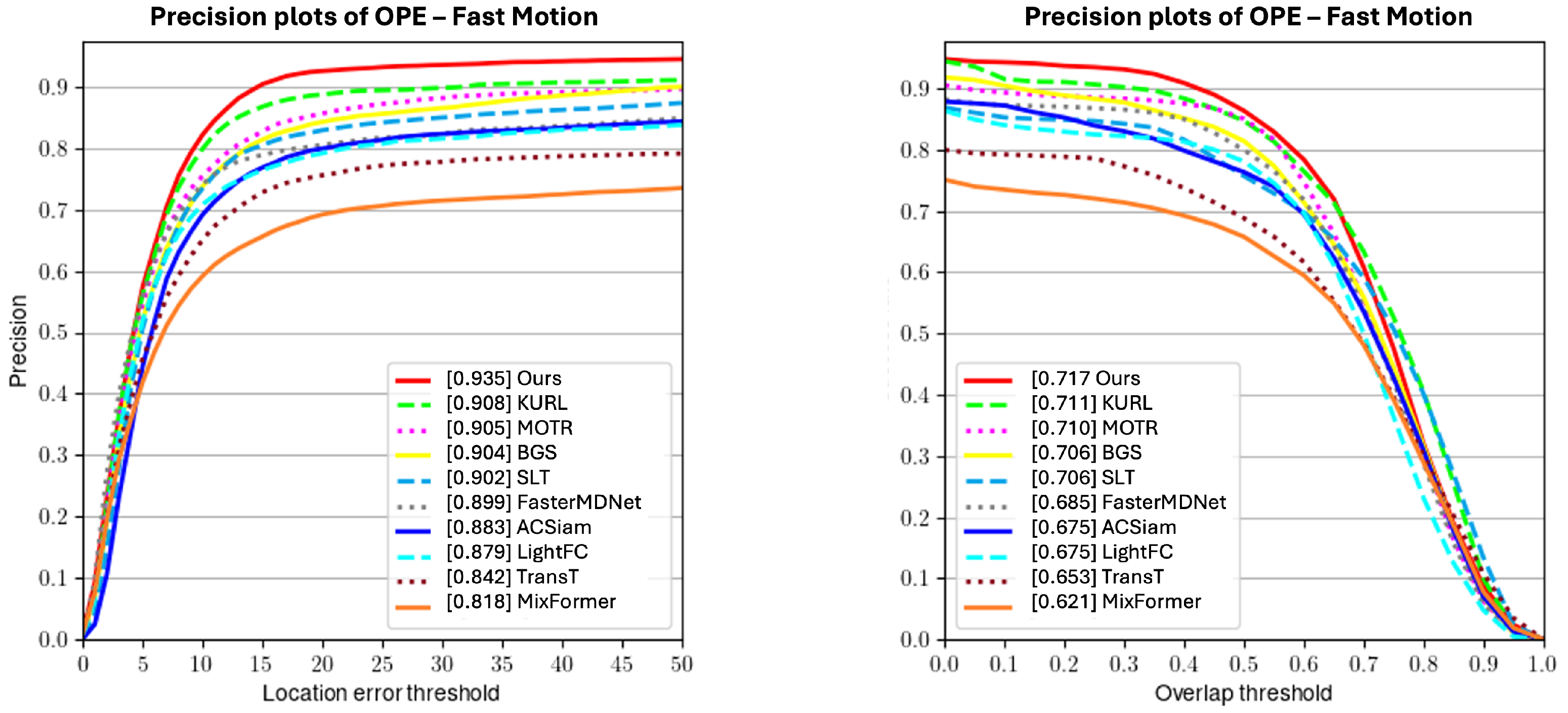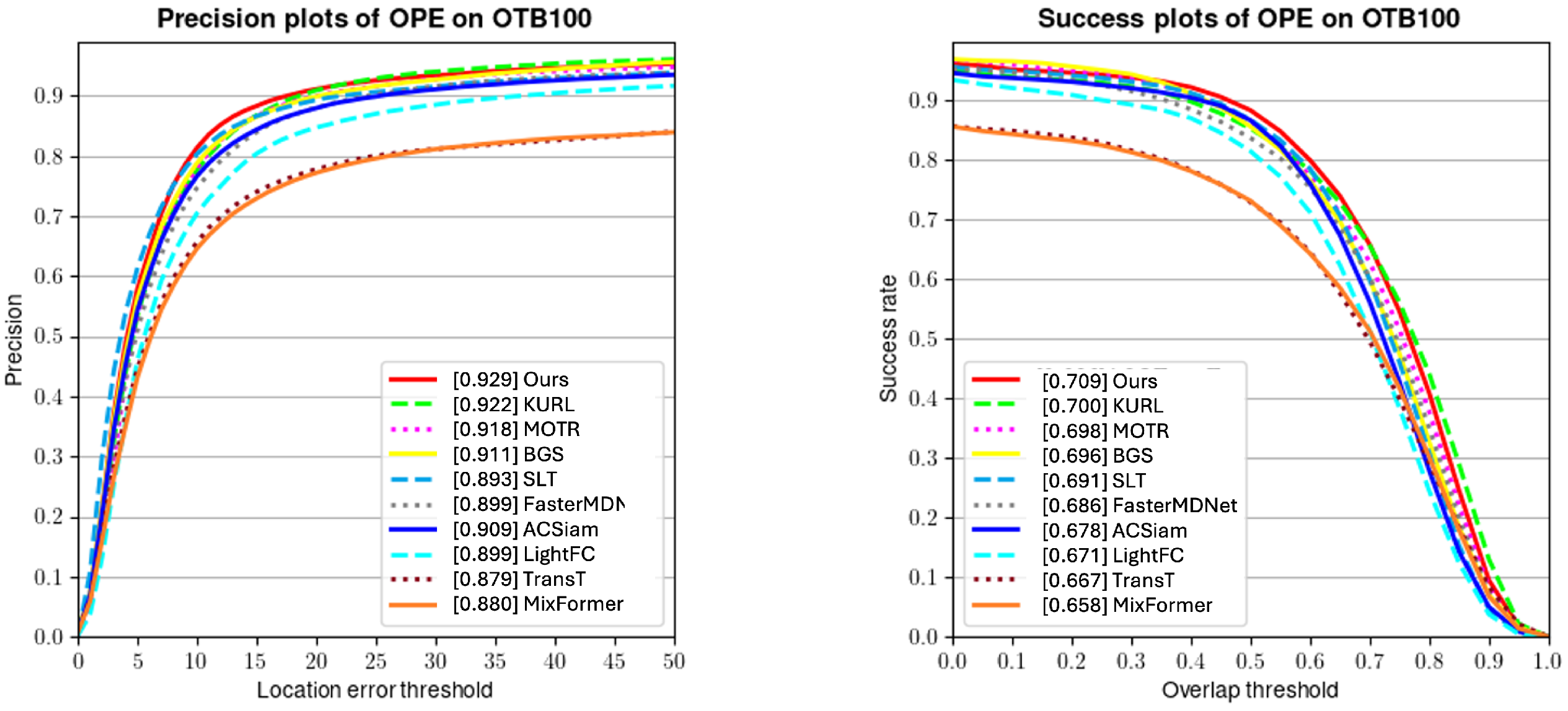 37] on the OTB100 dataset. All trackers are evaluated using the one-pass evaluation (OPE) protocol across the full sequence.