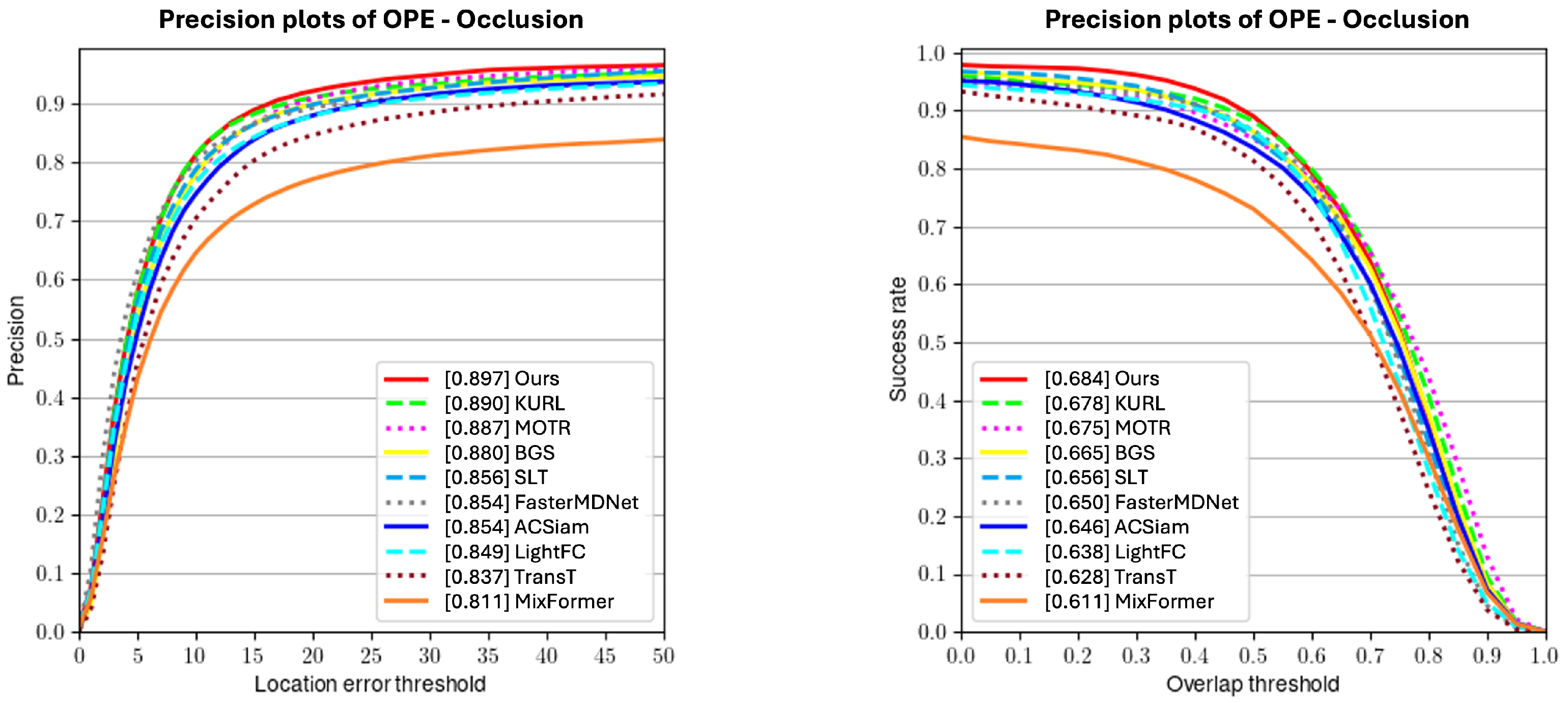 Figure 9, our method achieves a precision of 94.9% and a success rate of 68.4%, outperforming KURL by 4.8% and 0.8%, respectively, indicating that the proposed objective better guides learning under occlusion conditions.
