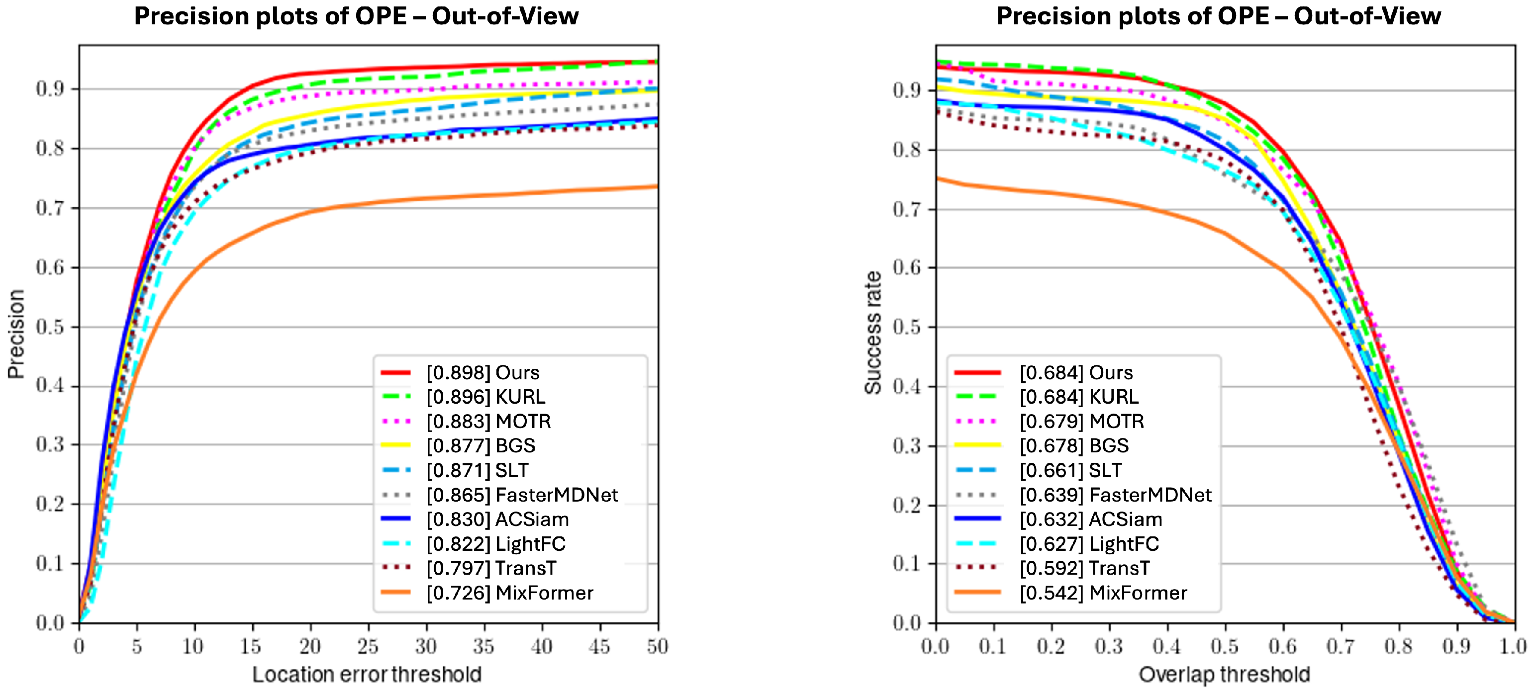 Figure 10, our method attains a precision of 89.9% and a success rate of 68.4%, outperforming KURL by 2.1% and 0.6%. This demonstrates that the RL-based sequence-level framework effectively models temporal dependencies and can recover targets after disappearance.