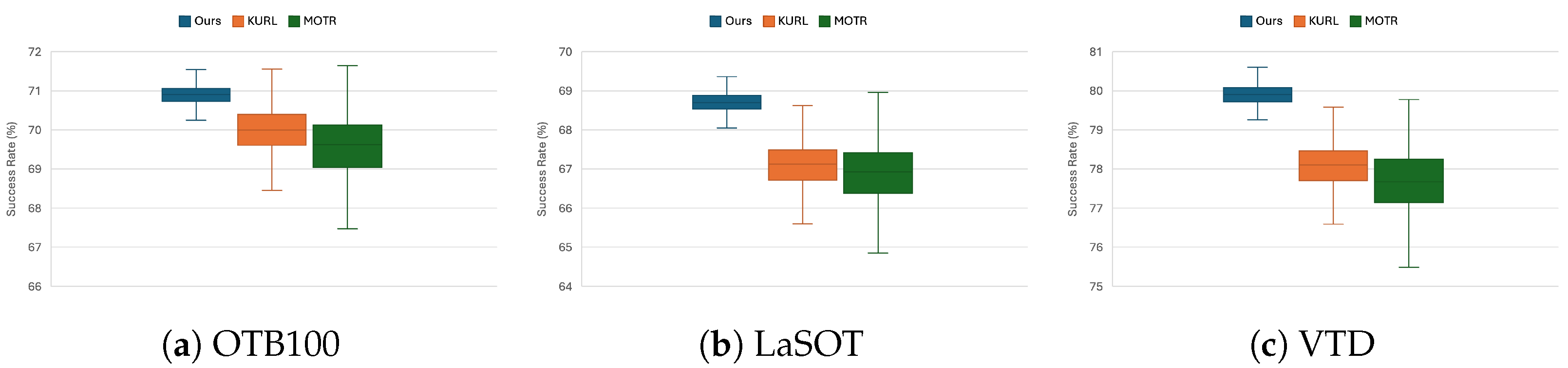Specifically, on OTB100, the SR values of Ours are concentrated within a narrow interval, demonstrating the most stable distribution among all compared methods. In contrast, KURL and MOTR present much wider IQRs and longer whiskers, indicating larger performance fluctuations. Similar trends are observed on LaSOT and VTD: the median SR of Ours consistently surpasses those of the baseline methods, while its IQR remains markedly smaller, suggesting that the performance improvements are consistently obtained across the majority of sequences. Moreover, Ours shows no apparent performance collapse (extreme low values) in any dataset, further verifying its robustness.