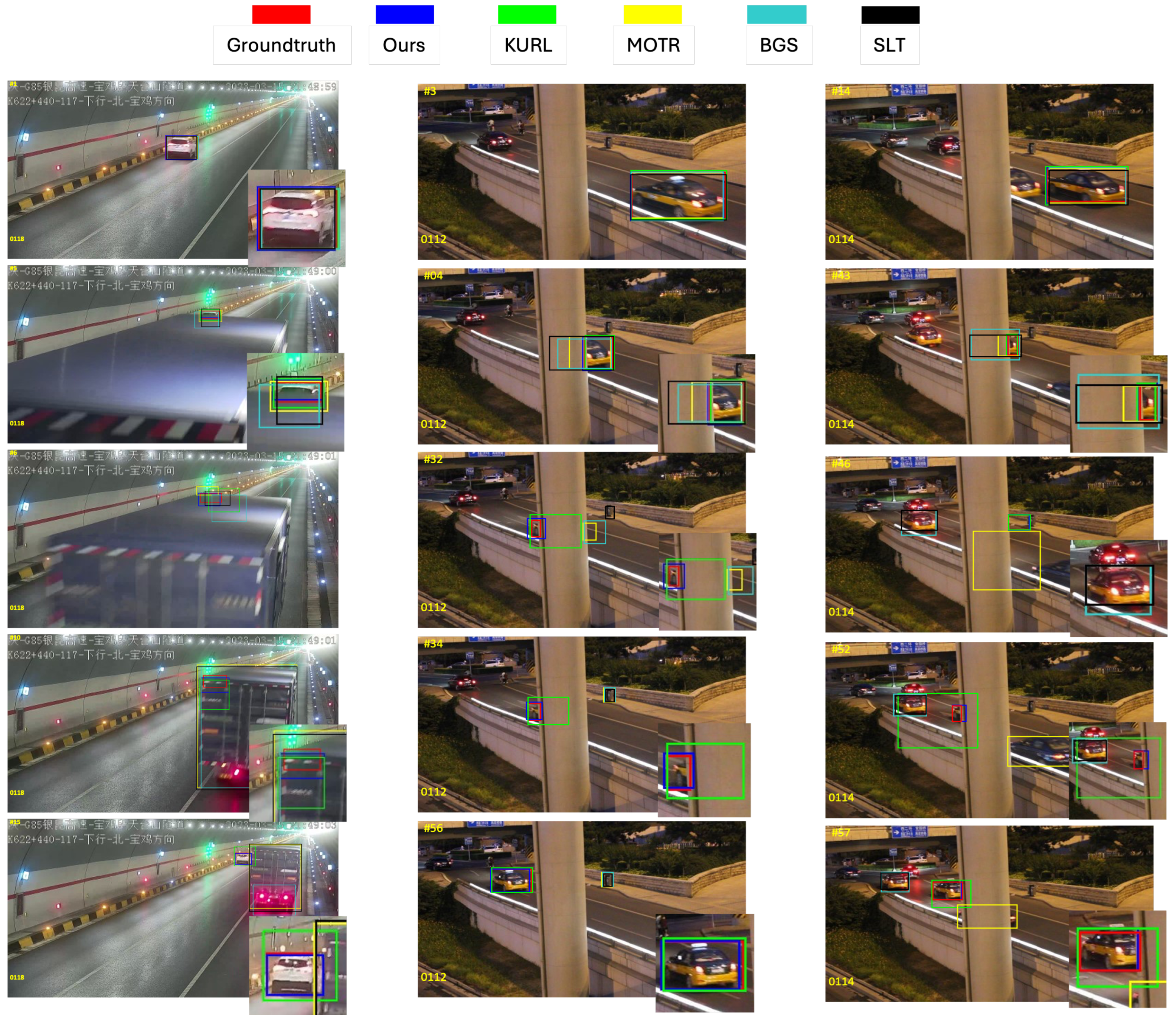Figure 13 (middle), at frame 43, most of the taxi body is occluded by an overpass pillar. SLT and TransT continue to localize the full-size vehicle, while our method and KURL adjust to only the visible portion. From frame 46 onward, as the taxi becomes fully occluded, MOTR enlarges its search region, while our method and KURL narrow it to avoid drift. Meanwhile, BGS and SLT incorrectly switch to similar-looking vehicles ahead. At frame 52, when the taxi front reappears, our method first locks onto it, MOTR mistakenly tracks another vehicle, and KURL performs a wider search. By frame 57, our method and KURL accurately track the target again, while other trackers still exhibit mis-tracking.