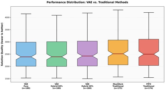 The Friedman test revealed significant performance differences across methods (χ2 = 19.87, p < 0.001, Kendall’s W = 0.828). VAE-based methods consistently achieved lower mean ranks (VAE_Pure: 1.50, VAE_Hybrid_60: 1.83, VAE_Hybrid_40: 2.67) compared to traditional methods (FIFO: 4.33, MWR: 4.67) across all six test instances, with mean makespan reductions ranging from 35 to 84 units. While post hoc pairwise comparisons did not achieve statistical significance after Holm correction due to limited sample size (n = 6 instances), the consistent direction of effects and substantial practical differences indicate meaningful performance advantages.