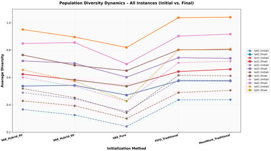 Population diversity is a critical performance indicator for evolutionary algorithms and swarm intelligence methods, providing a measure of how effectively an algorithm explores the search space. In combinatorial optimization problems such as JSSP, the diversity of the initial population directly impacts the algorithm’s balance of exploration and exploitation. Low diversity increases the risk of premature convergence, while excessively high diversity can lead to inefficient search. This study analyzes both the initial and final population diversity of different population initialization strategies to examine the search dynamics of VAE-based methods compared to traditional heuristic-based methods. Monitoring population diversity is an important tool for understanding how an algorithm adapts to problem complexity and the relationship between solution quality and search strategy.