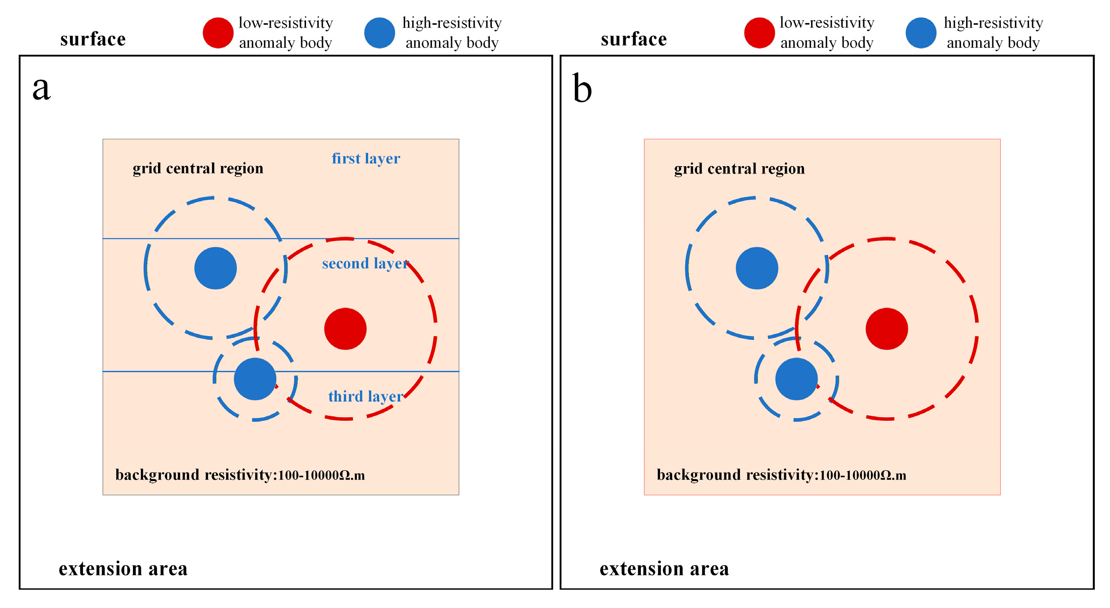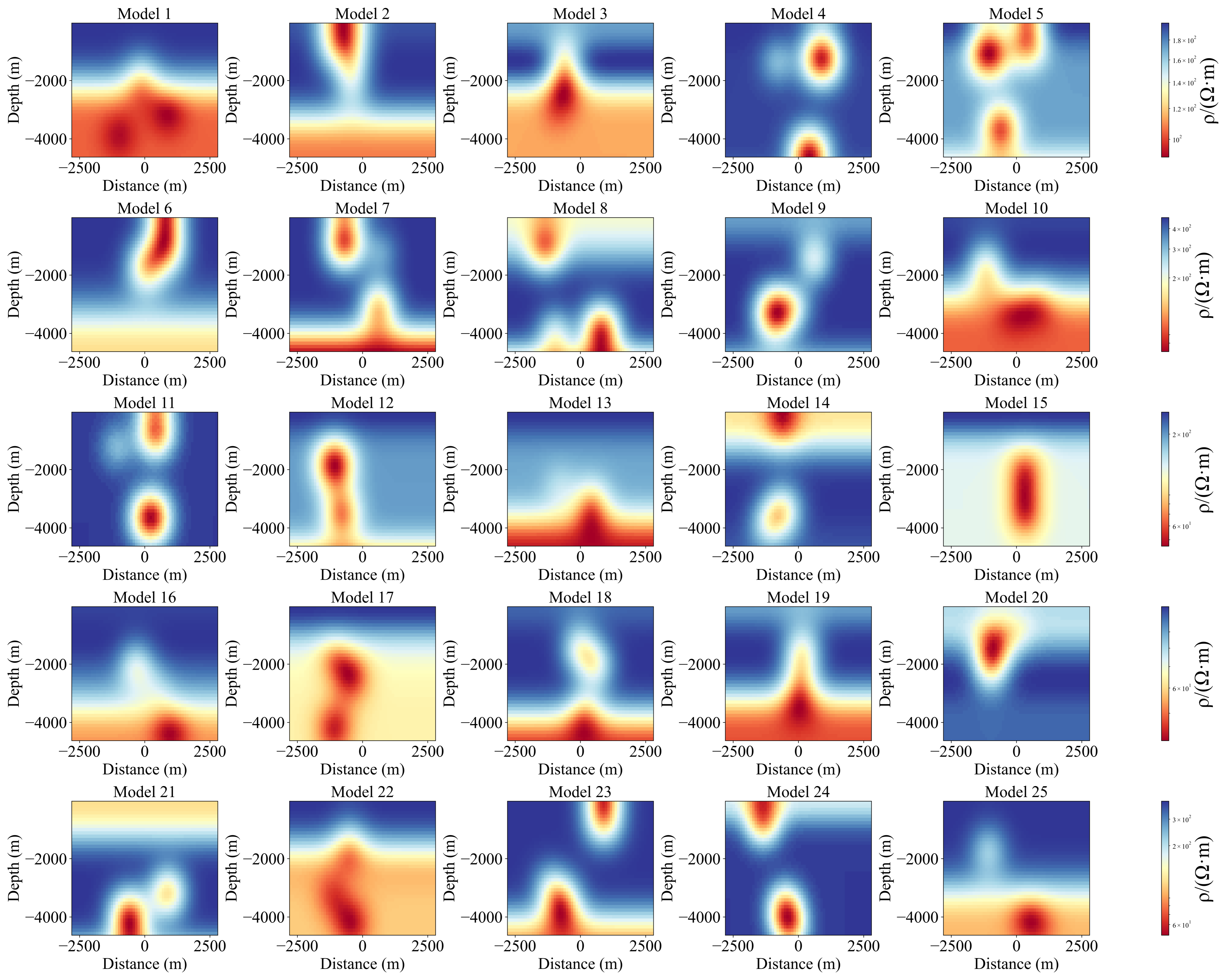- Due to the wide range of resistivity changes in the model (1–10,000 ), in this article, a base-10 logarithmic transformation is applied to the sample data and sample labels, mapping all data to the same order of magnitude as the network input. This logarithmic processing effectively reduces the weight difference between strong and weak signals during network training and reduces the influence of noise on model training as follows: