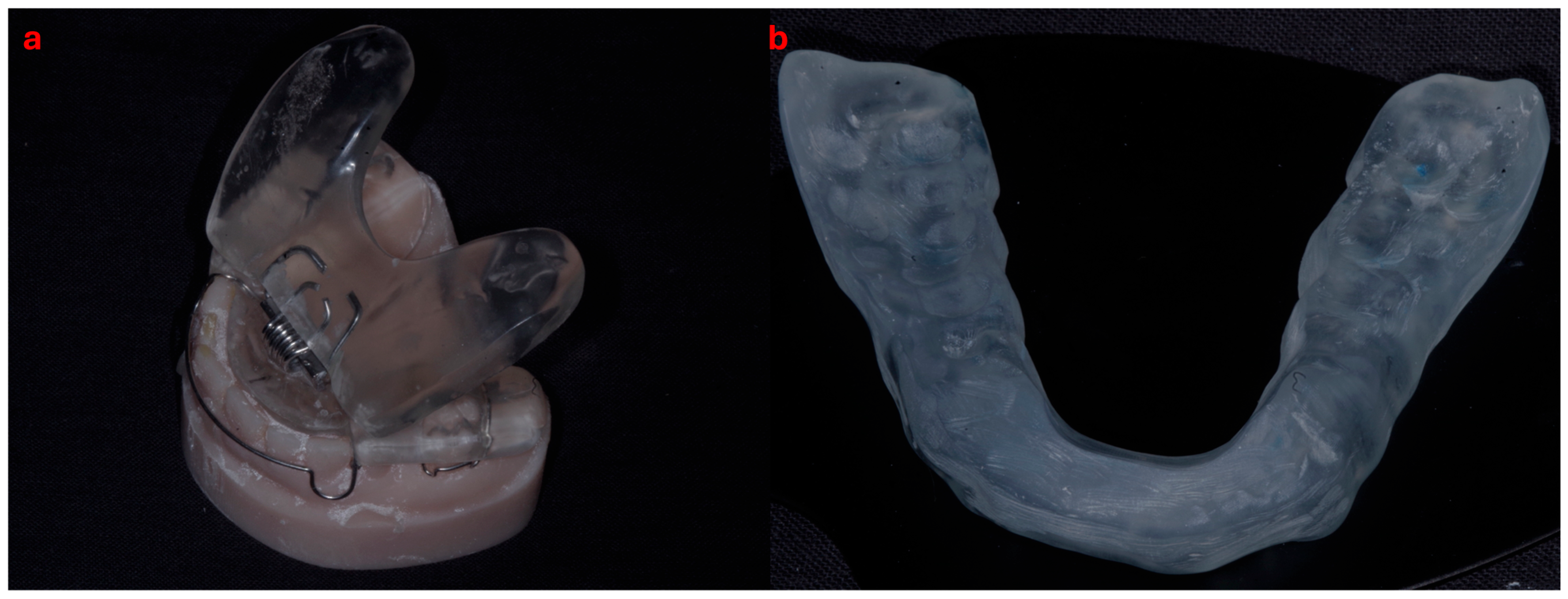 - Montiel, R.R.R.; Gordillo-Renteria, G.A.; Ramos, L.P.; Palmas, S.O.; Campoverde, L.A.G.; Padrón, M.I.C.; Cumbicus, J.Y.R.; Barreto, F.G.C. Effectiveness of Oral Splints in Temporomandibular Disorders. In Dental Trauma—Expert Strategies; IntechOpen: London, UK, 2024. [Google Scholar]