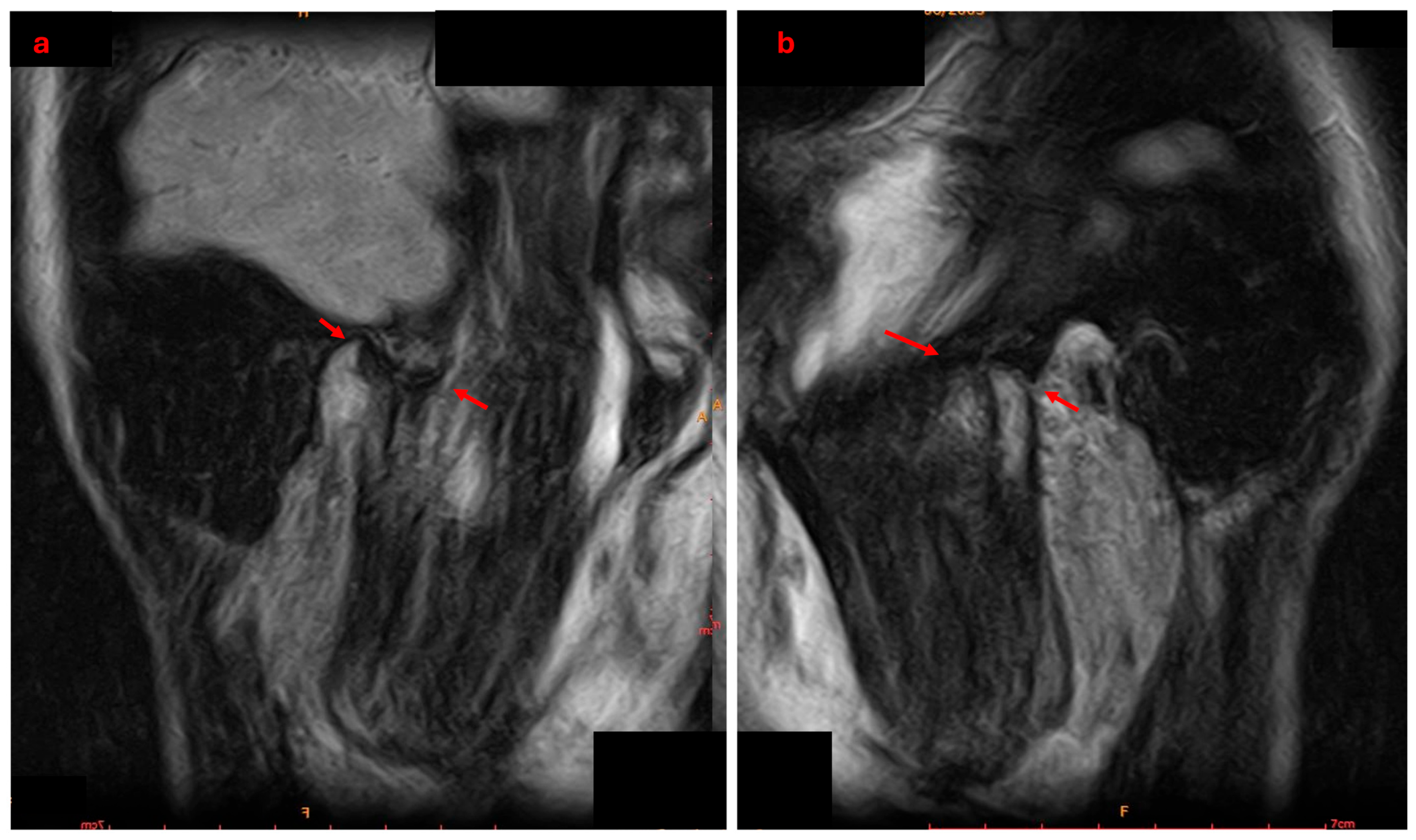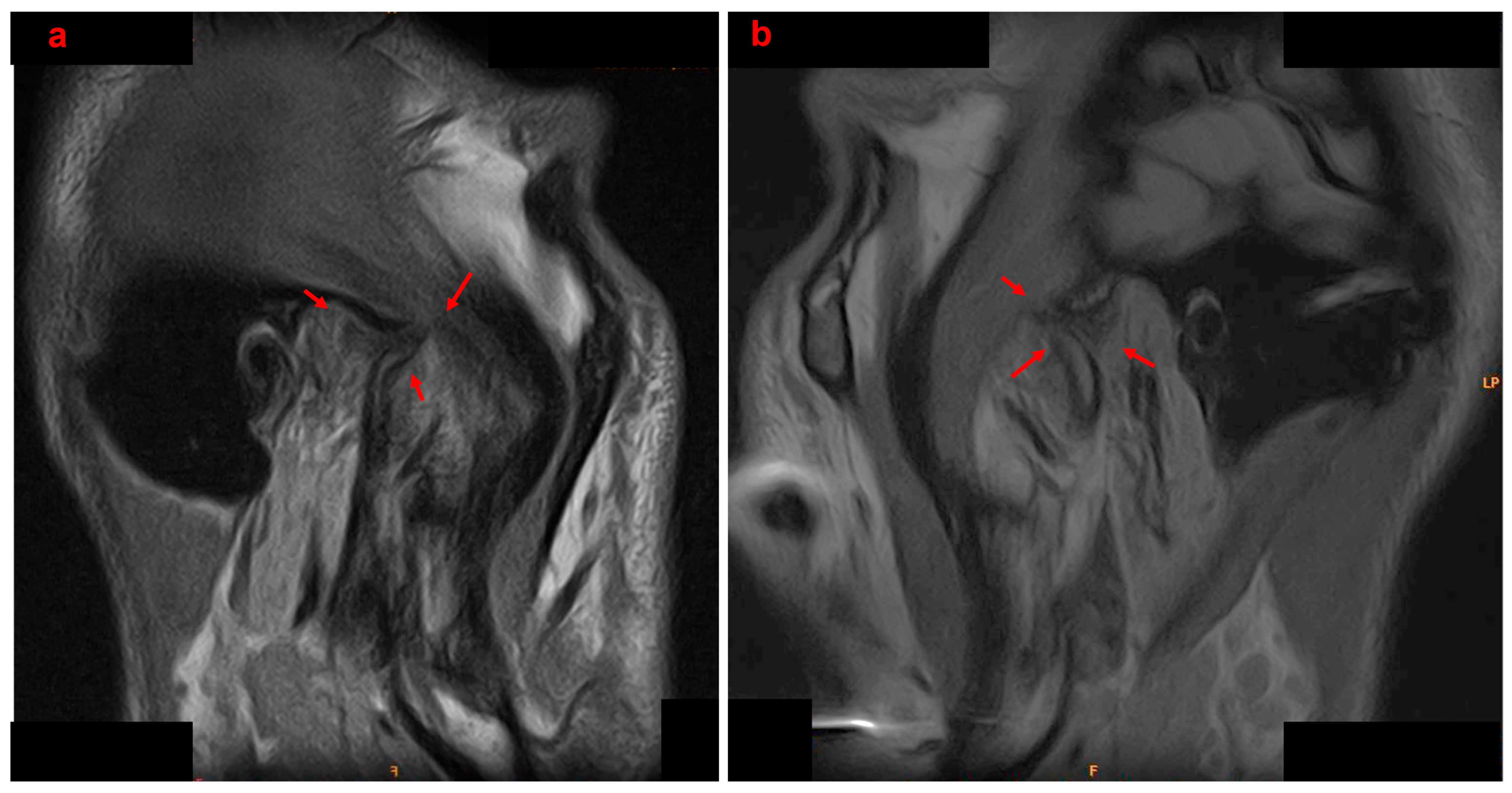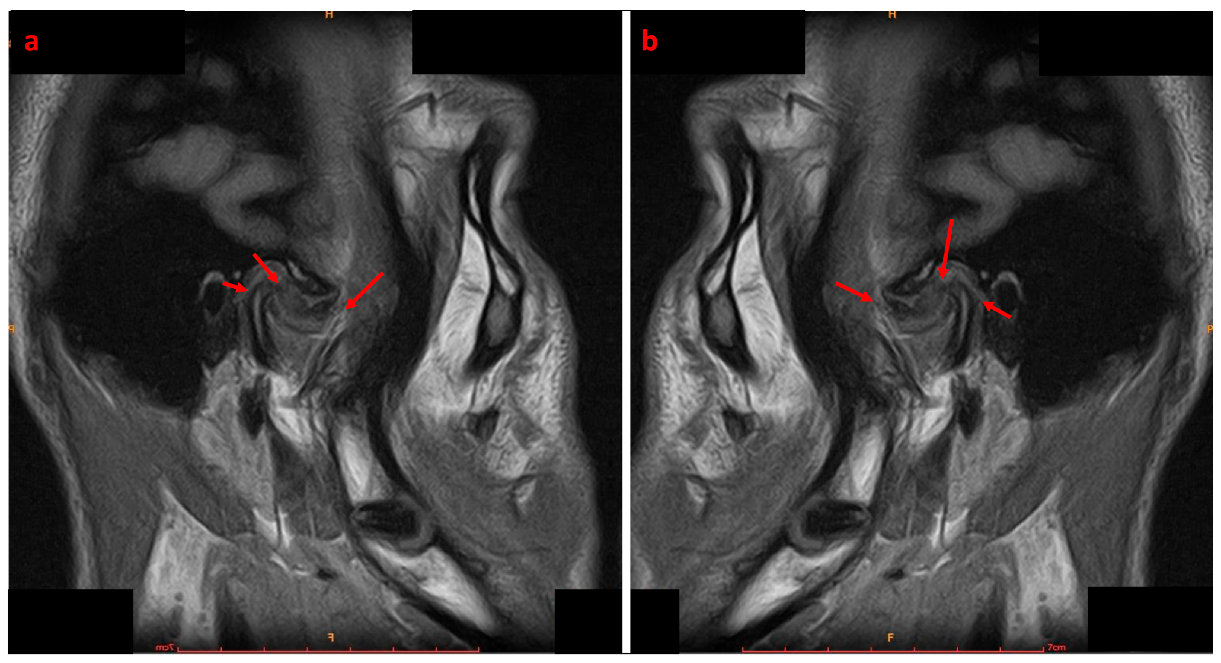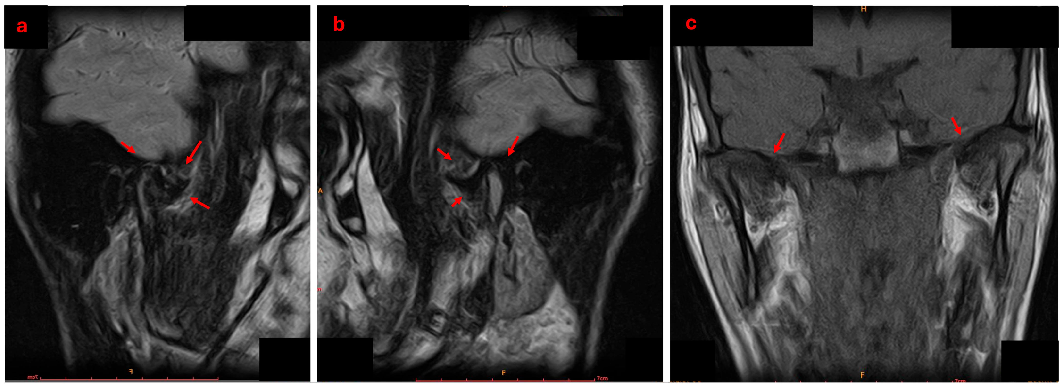 - Hasan, N.M.A.; Abdelrahman, T.E.F. MRI evaluation of TMJ internal derangement: Degree of anterior disc displacement correlated with other TMJ soft tissue and osseous abnormalities. Egypt. J. Radiol. Nucl. Med. 2014, 45, 735–744. [Google Scholar] [CrossRef]