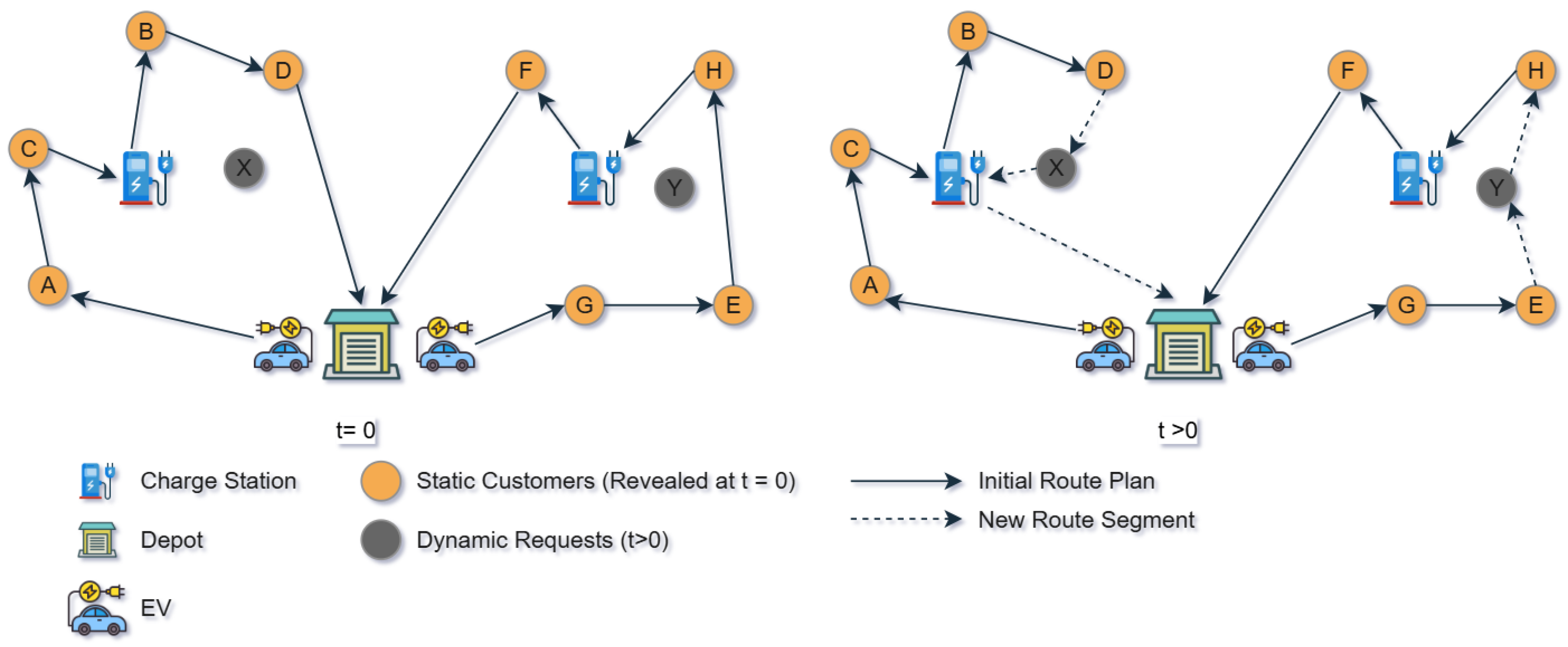 11]. In this study, the D-EVRP is considered, where customer requests are revealed progressively during operation and routing decisions must be adapted online under electric vehicle-specific constraints. In contrast to static plan for EVRP variants, D-EVRP requires simultaneous consideration of dynamic request arrivals, limited battery capacity, charging station availability, and recharging decisions. These characteristics naturally define the problem as a sequential decision-making process under uncertainty, in which routing, charging, and service actions are tightly coupled.