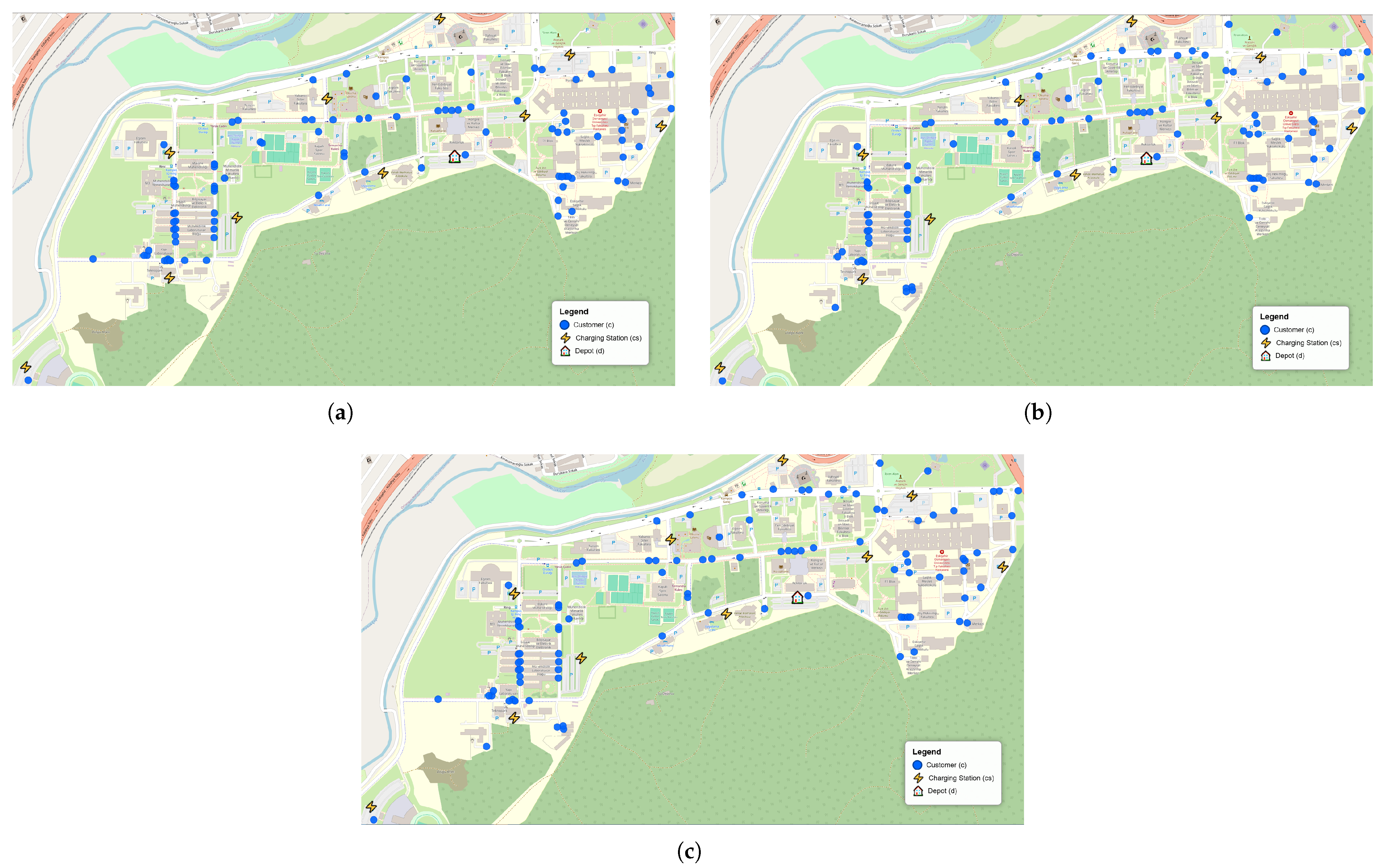 All experiments were conducted using a real distance matrix, customer clusters, and charging stations defined on the Eskişehir Osmangazi University (ESOGÜ) campus. Thereby, providing a reproducible framework for future research.